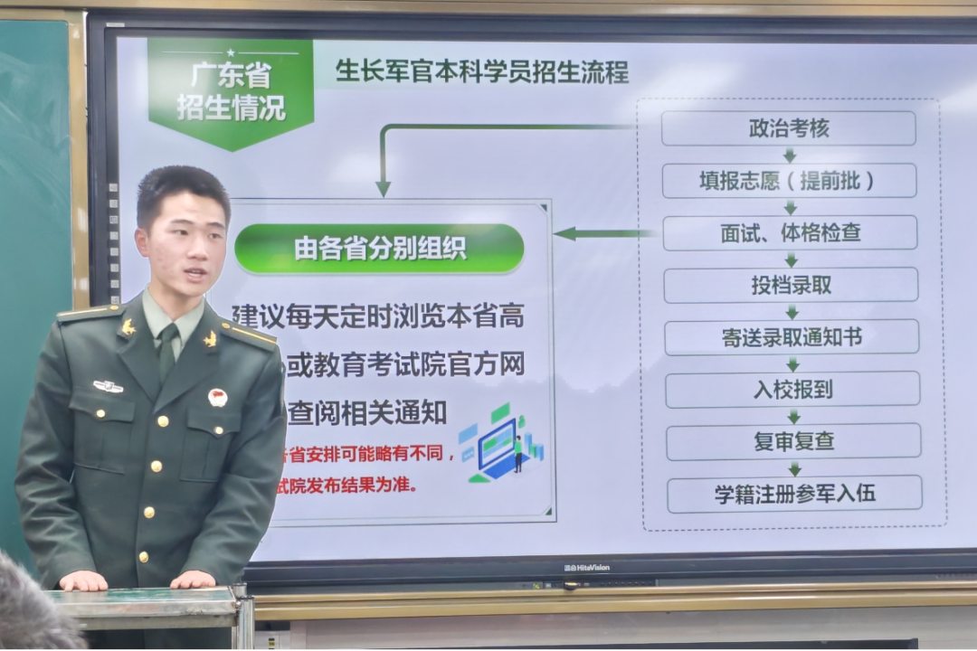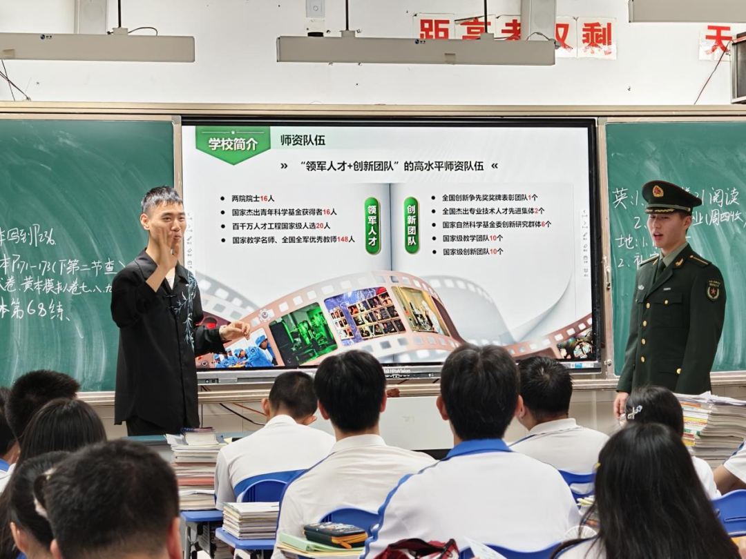 活动采用“进班分享+集中宣讲”的形式开展。宣讲团成员两人一组默契配合,结合成长经历,用亲切乡音讲解学校的办学特色、专业优势、招生政策及军校日常,既达成了个性化、近距离的交流效果,又进行了系统的政策解读,回应了考生与家长的报考疑问。活动点燃了青年学子携笔从戎、投身国防的热情,也让学员们在分享中重温初心、坚定强军信念,搭建起双向沟通的桥梁。