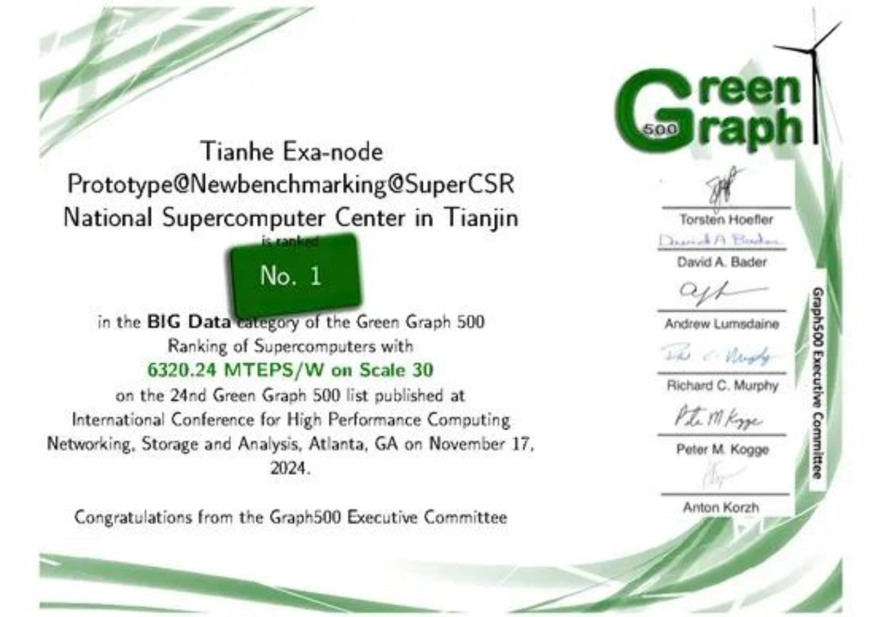 由国防科技大学计算机学院研制并部署于国家超级计算天津中心和长沙中心的国产主机系统分别荣获Graph500大数据图计算能效(GreenGraph500 Big Data)世界第一名和小数据图计算能效(GreenGraph500 Small Data)世界第一名, 图(Graph)是一种用来表示事物之间关系的数据结构, 超算在数据密集型应用方面取得了国际领先突破