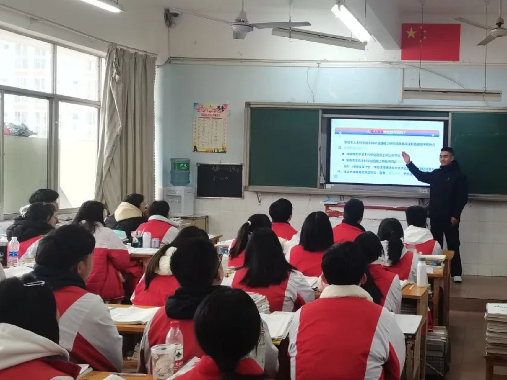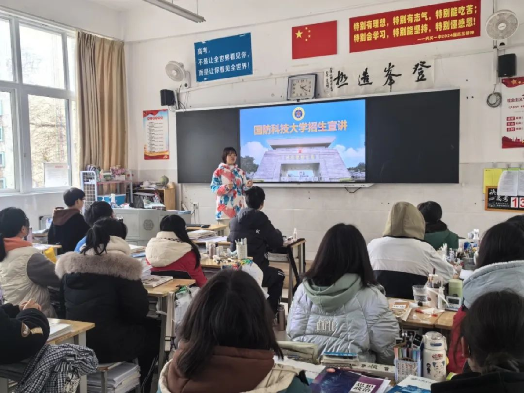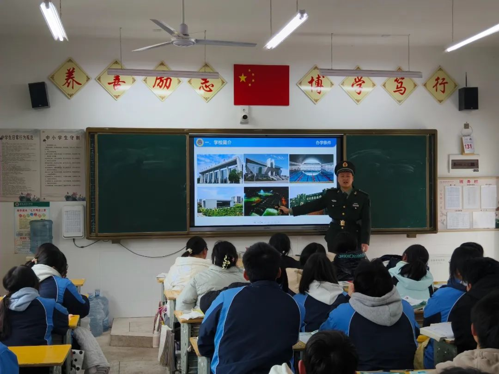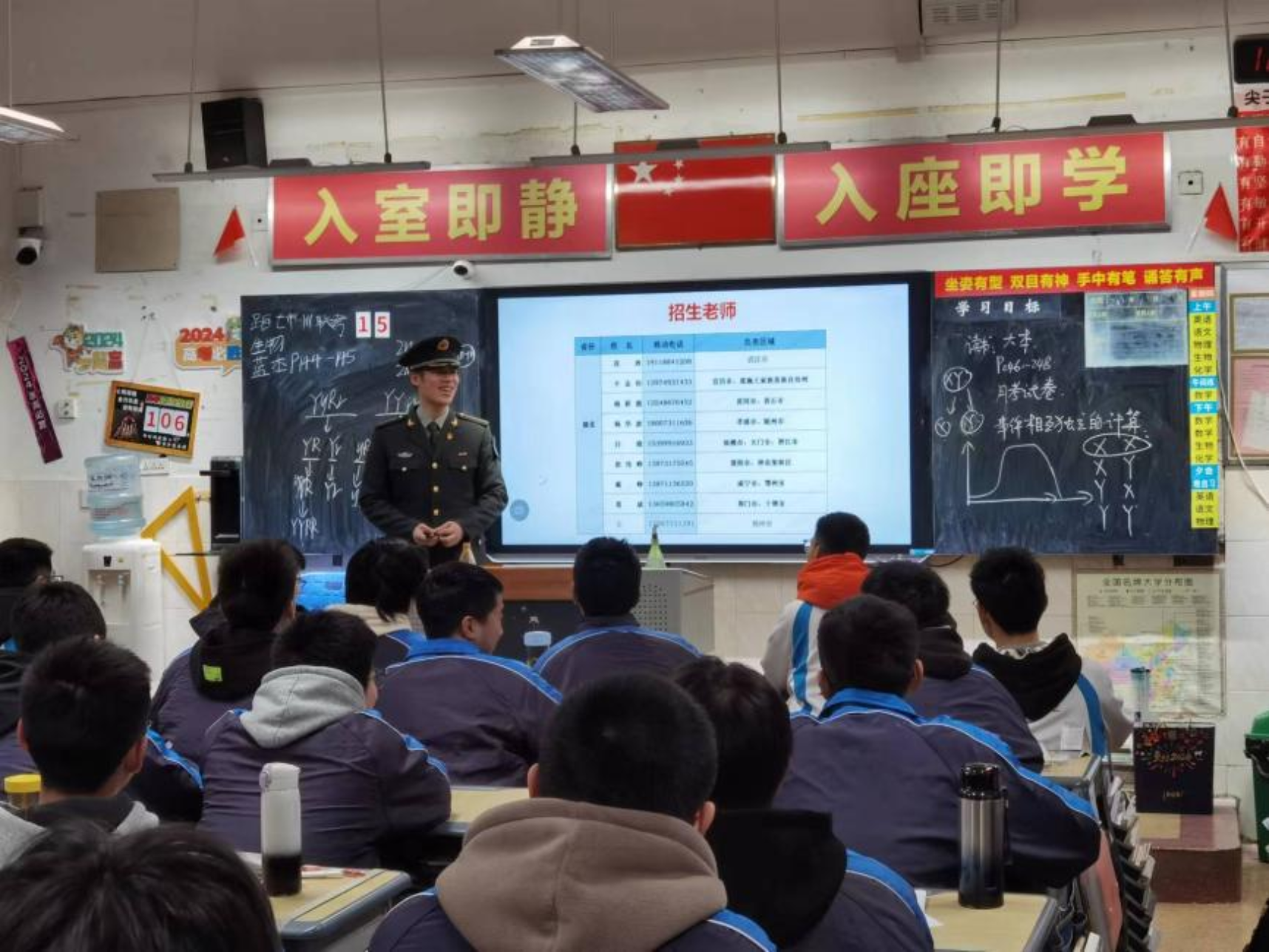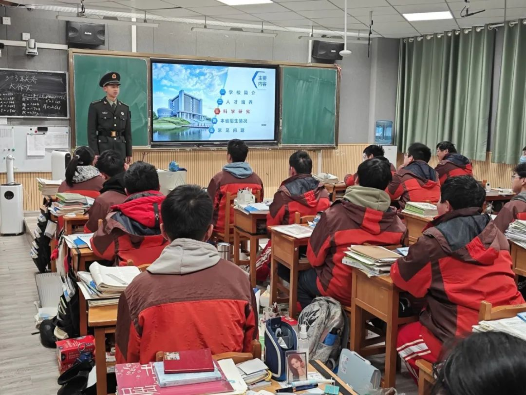 寒假期间,学校无军籍地方本科学员敖进东回到遵义市桐梓县第一中学开展招生宣讲。敖进东向学弟学妹们介绍了国防科技大学的招生政策、人才培养模式等,同时,结合自身学习生活经验,分享真实感想感受,鼓励高三学弟学妹们报考国防科技大学。宣讲过程气氛热烈,同学们纷纷表示希望自己能够考入国防科技大学,为强军事业贡献一份力量。