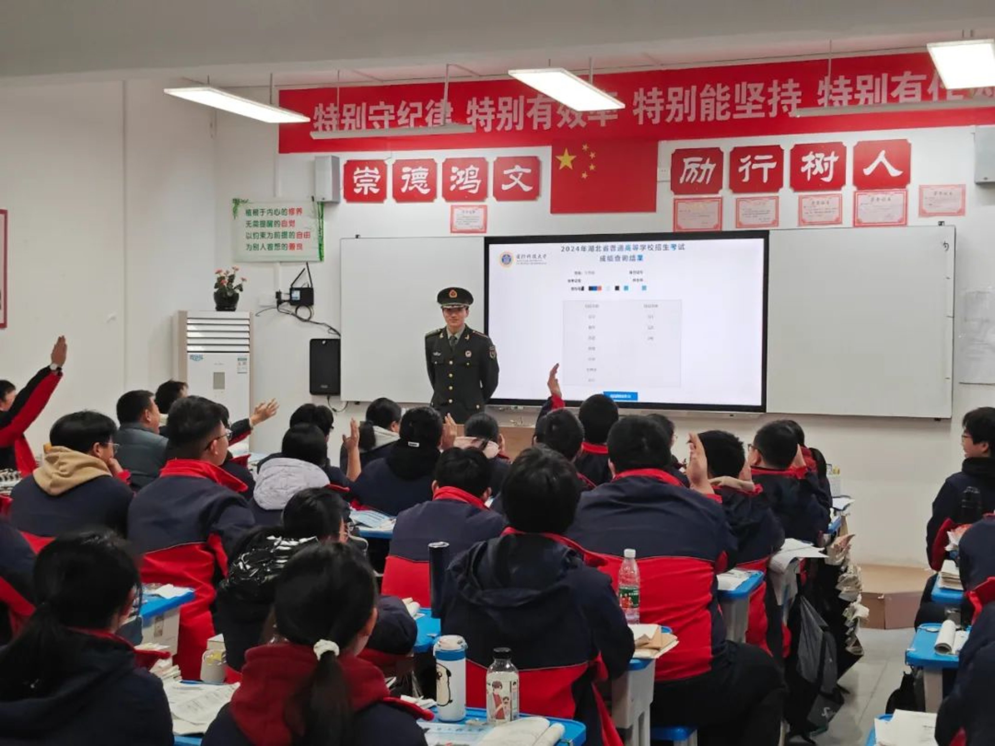 在宣讲现场,王维超通过播放招生视频《向新为战》,向学弟学妹们展示国防科技大学的校园风光和办学成果,并结合自身成长经历,详细讲解了学校的历史沿革、办学特色以及在湖北省的具体招生政策等内容,同时分享了高中各学科的学习方法。互动环节,大家积极踊跃提问,王维超依次耐心详细解答。整个活动组织得井然有序,有效激发了同学们筑梦国防的热情。