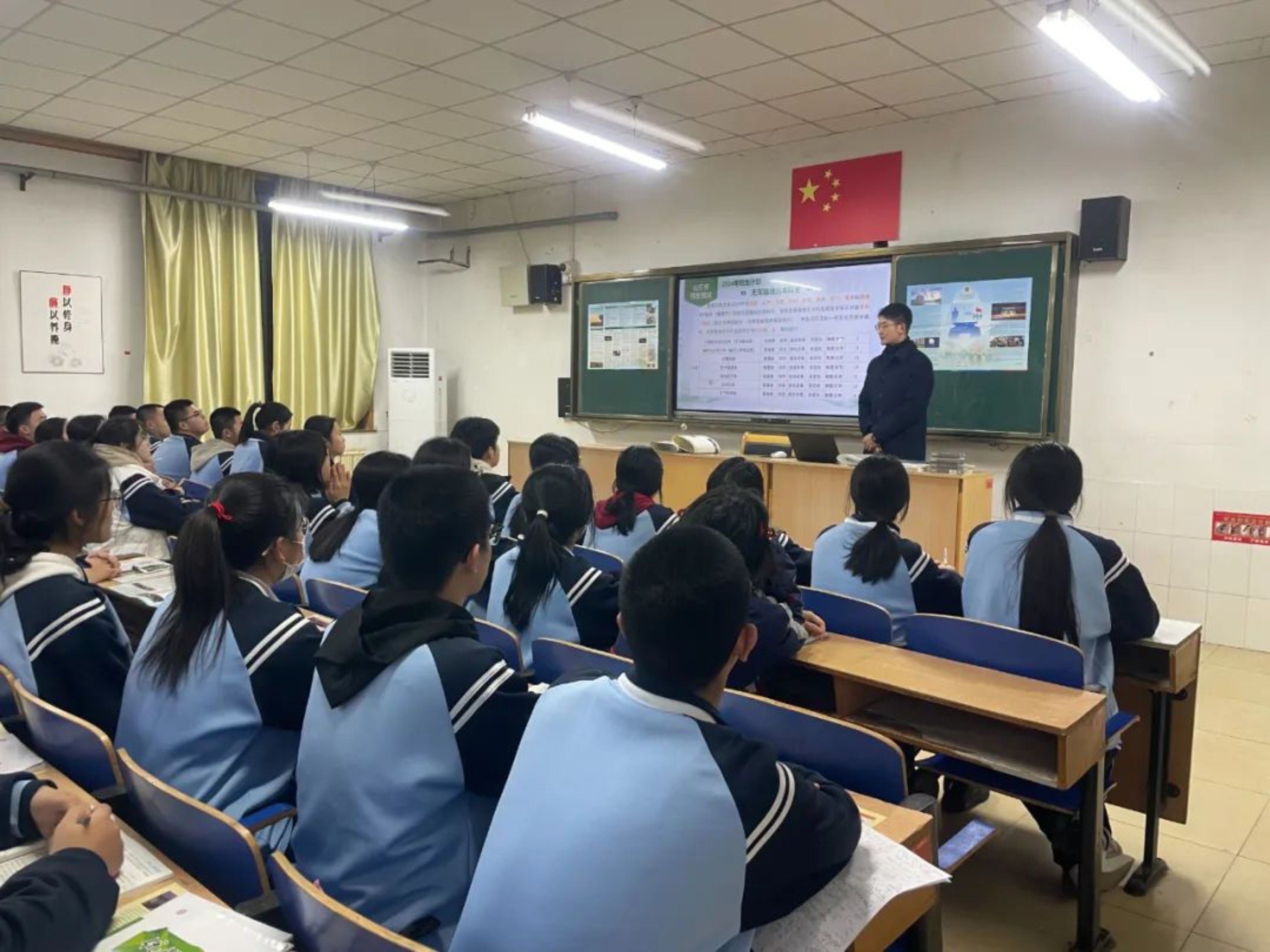 宣讲当天,宣讲团成员分两组走进不同班级进行宣讲。王擎向高三学子详细介绍了科大的悠久历史、院系特色、学科专业,分享了科大的日常生活。陈忆年向高三学子介绍了军校招生政策、军检要求等内容,分享了高考备考经验。在自由问答环节,高三学子踊跃提问,反响热烈,宣讲团成员一一进行解答,并结合成长经历鼓励大家在最后的冲刺阶段稳住心态,争取取得优异成绩。
