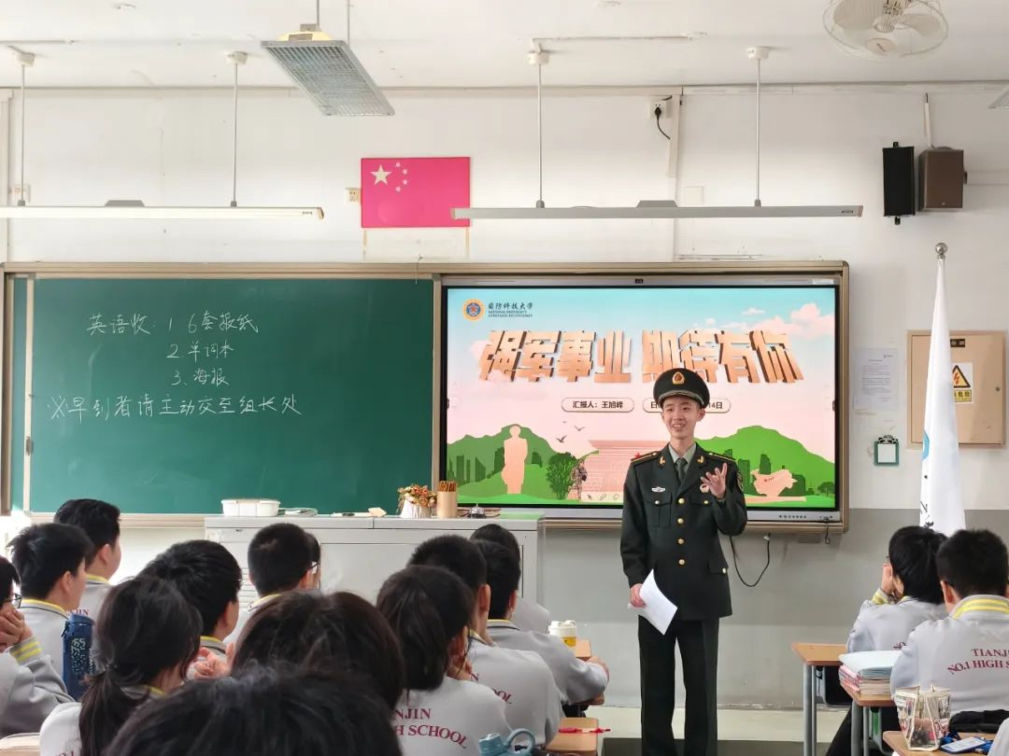 近日,在天津招生组时向泉老师的指导下,毕业于天津市第一中学的科大学员回到母校开展招生宣讲活动。宣讲团向同学们介绍了国防科大的优势特色与招生政策,分享了精彩难忘的军校生活,讲述了成长经历与思想蜕变,交流了学习方法与生活经验,鼓励大家成为胸怀祖国、全面发展的优秀青年。