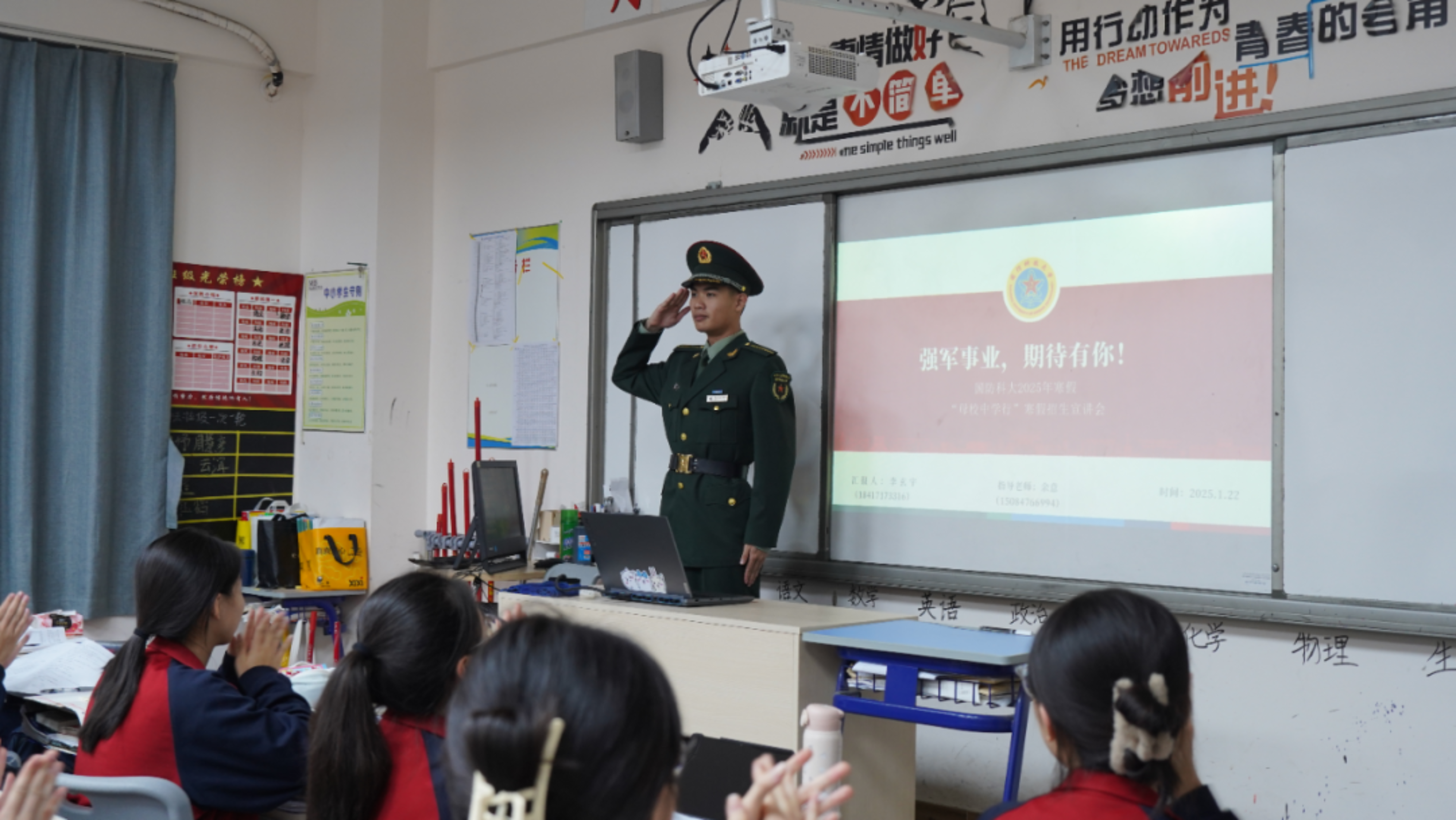 2025年寒假,国防科技大学“母校中学行”汇报宣讲活动火热进行,3600余名本科学员陆续回到母校中学,汇报成长历程、畅谈军校生活、讲述科大故事、分享学习经验,为学弟学妹答疑解惑、引路领航,鼓励优秀学子积极投身国防事业,踏上强军征程。
