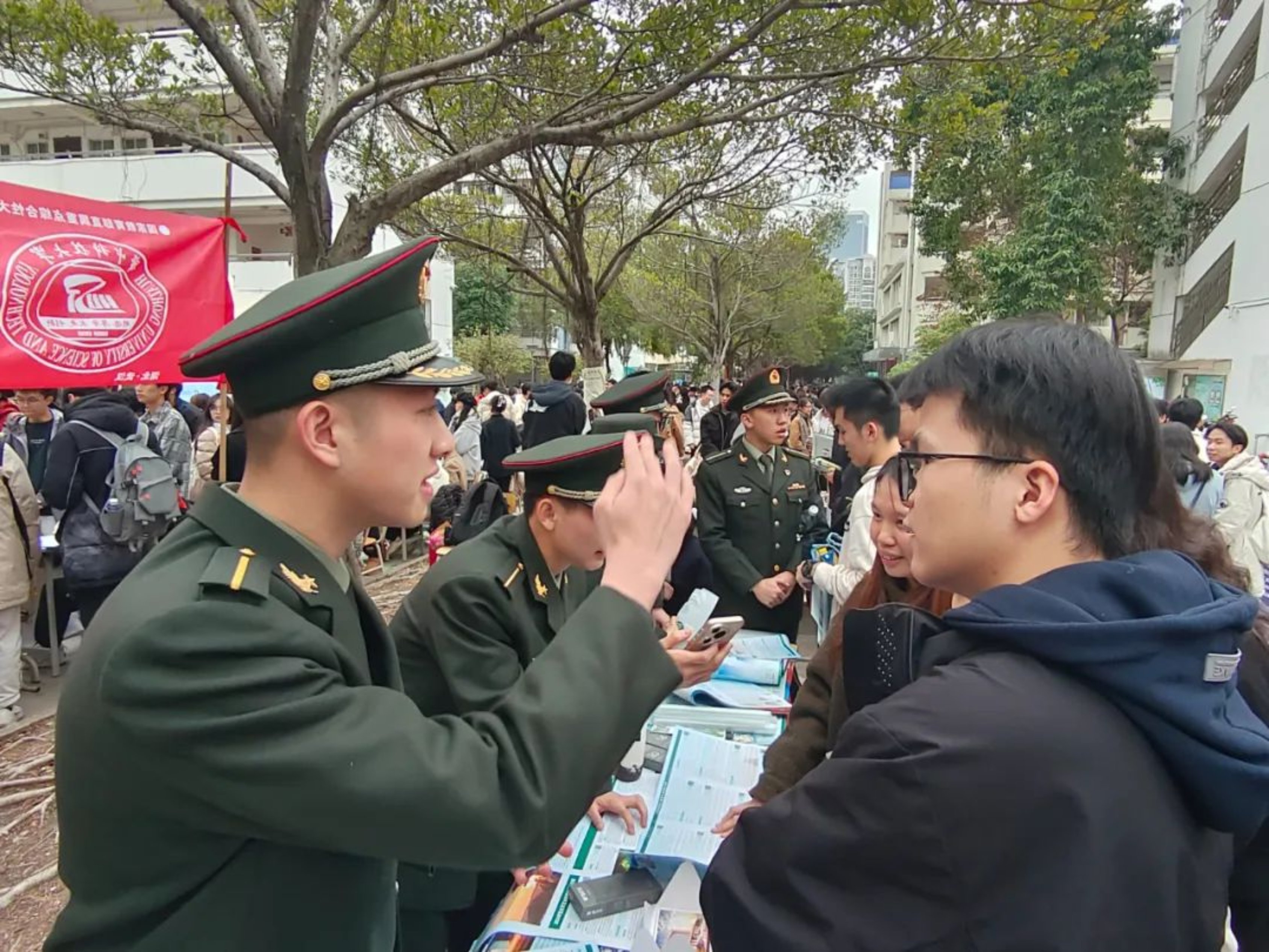 宣讲采取进班宣讲和设点答疑的形式组织。宣讲环节中,伍迪介绍了国防科技大学的办学历史、人才培养和科研成果等内容;雷振威分享了初入军校的成长经历,从课程学习、军事训练、学术竞赛等方面,讲述了自己的成长与收获。答疑环节中,夏宇、梁德钊等成员为有志报考军校的学子们介绍科大基本情况,解答关于军检标准、报考流程、校园生活等问题。宣讲团还向同学们分发了学校主题文创产品,鼓励大家投身国防事业当中。