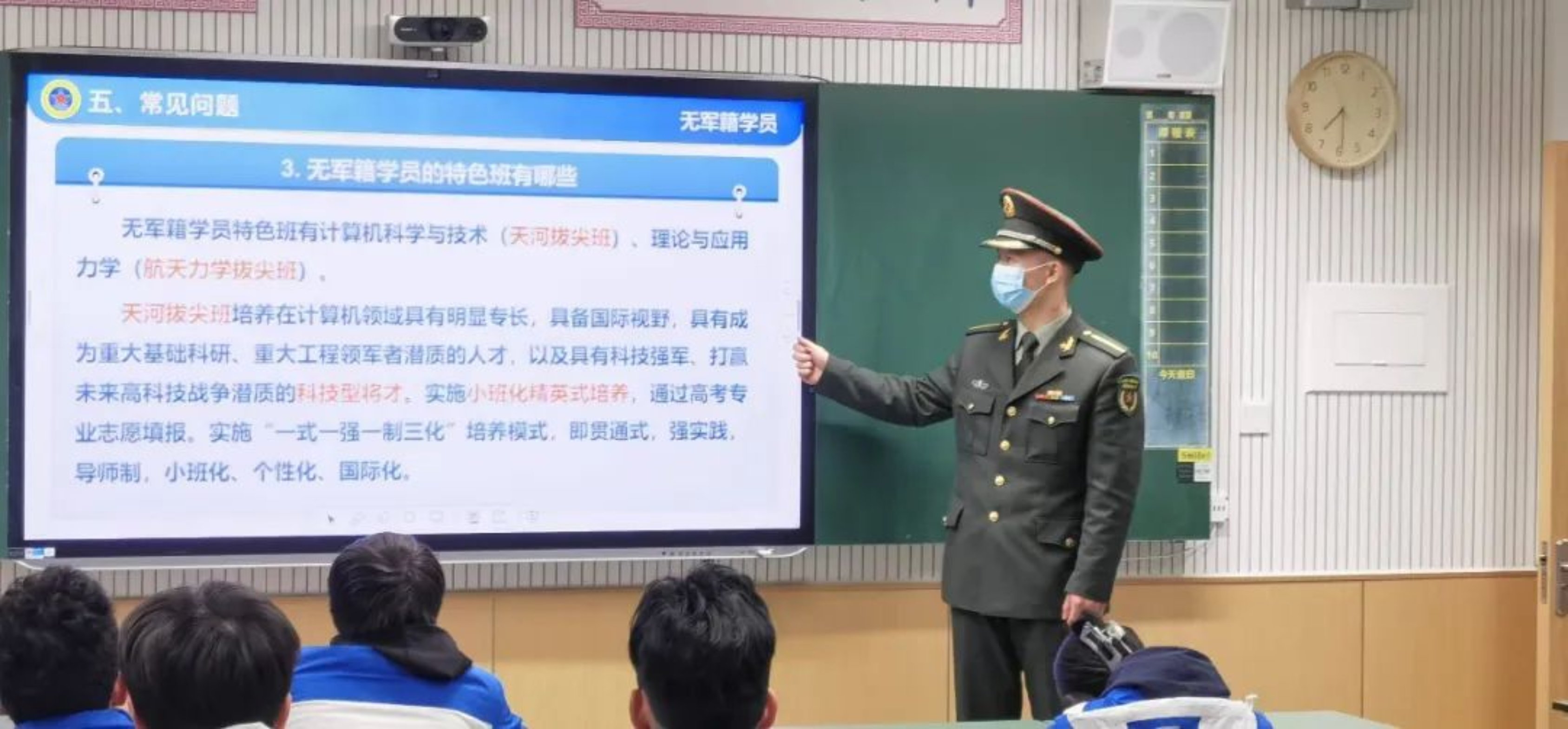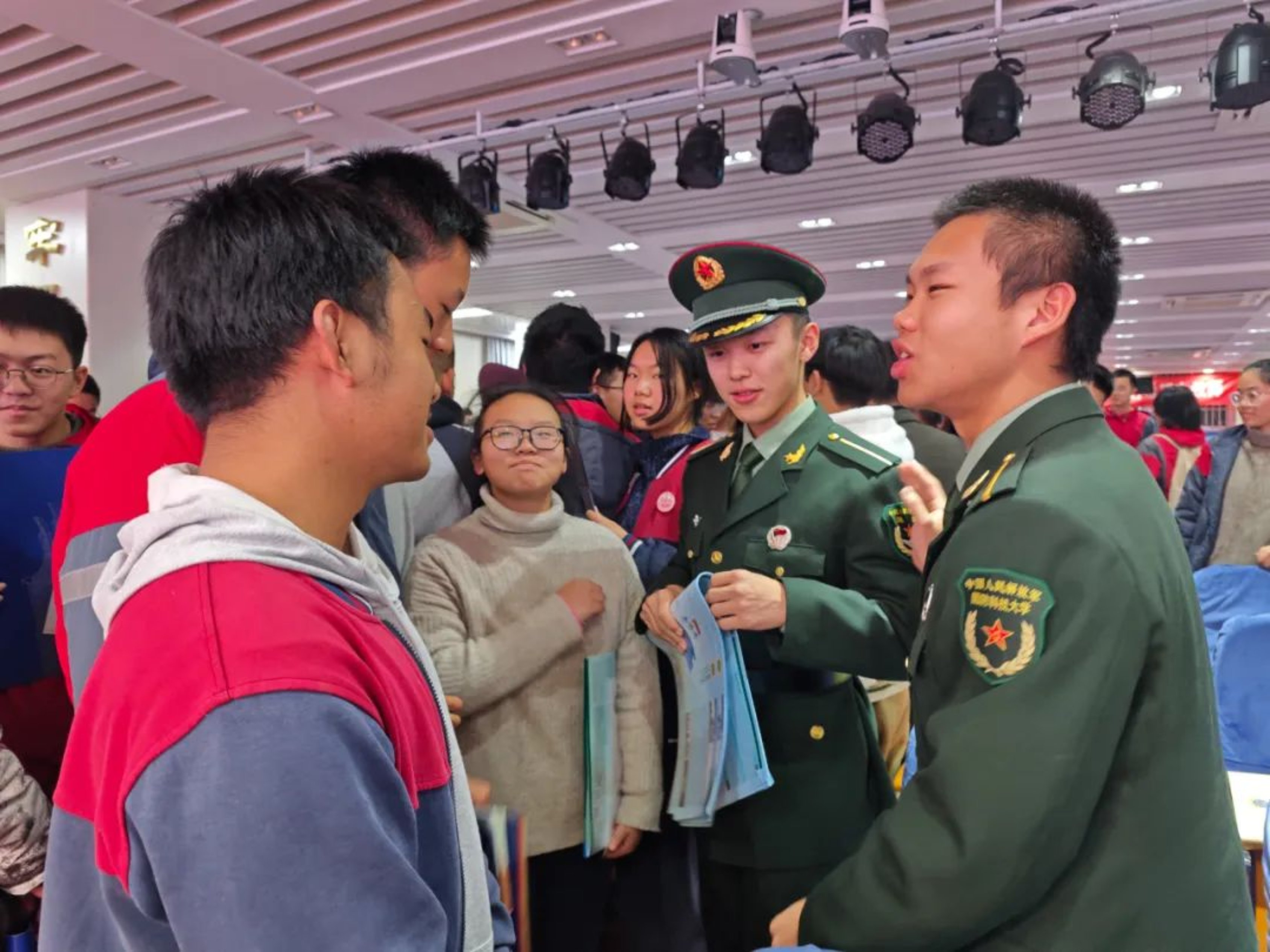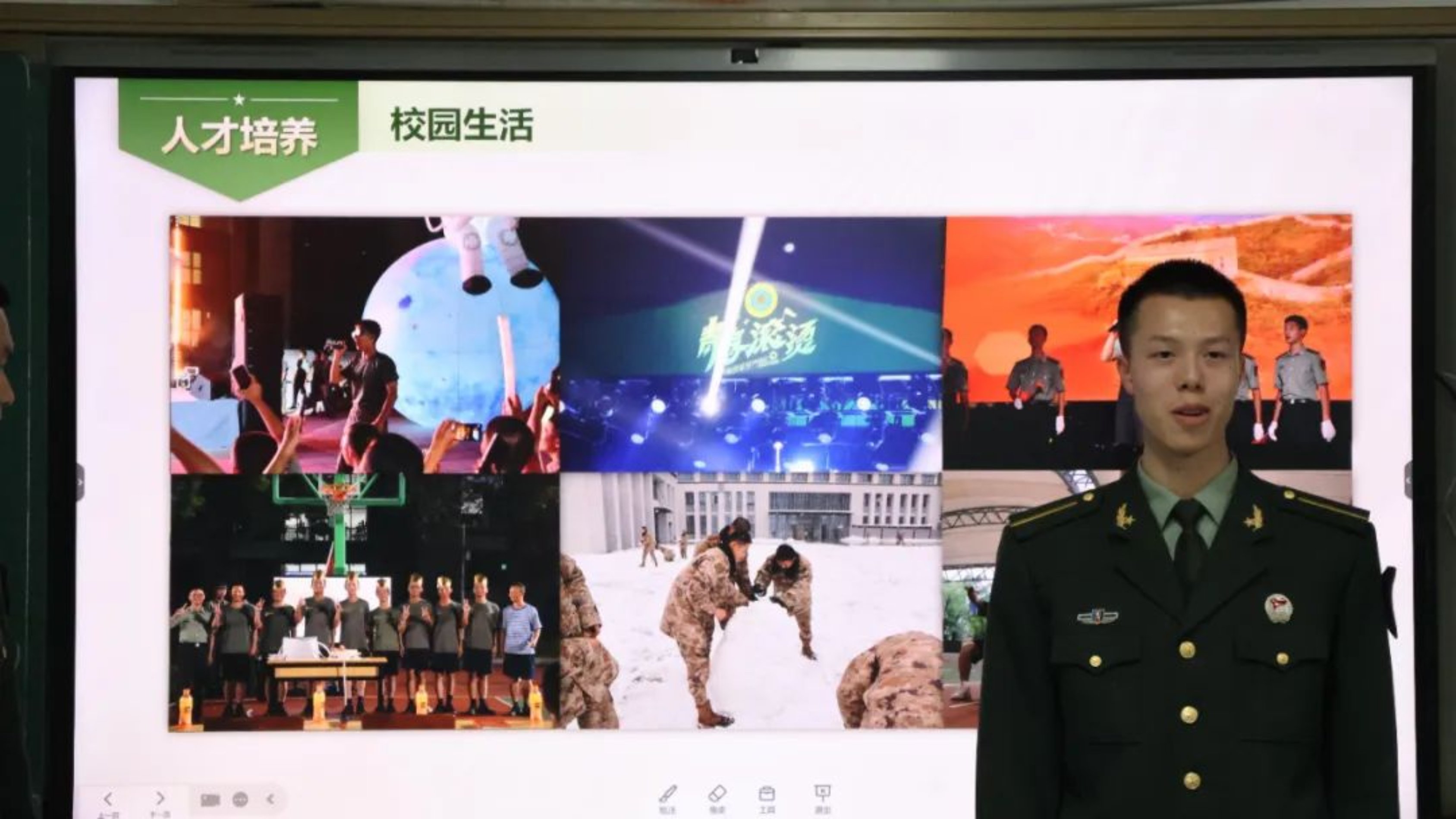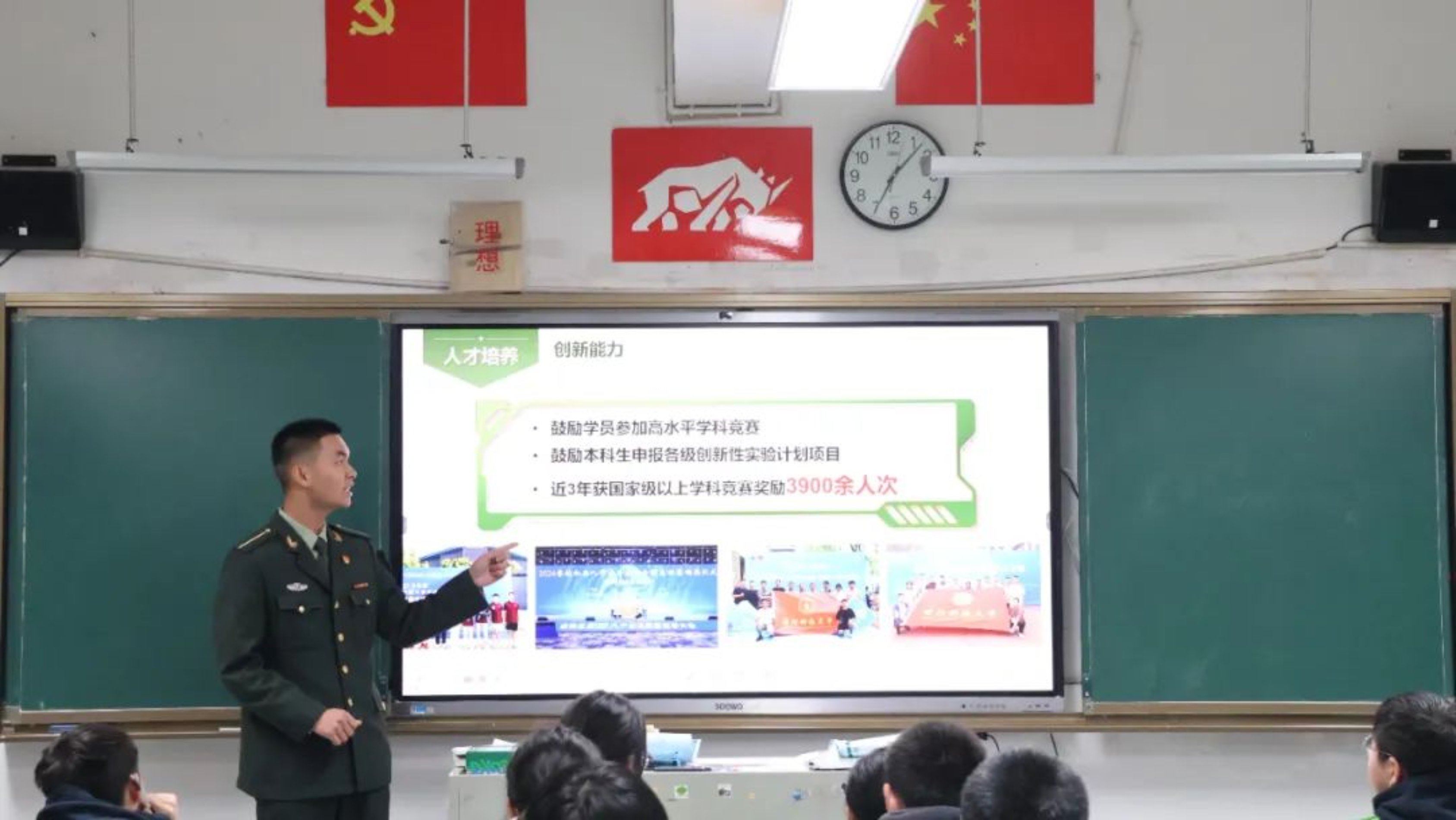 杜君豪从科大的发展历程、人才培养、科研成果等方面进行介绍,同时结合校园生活分享成长故事,为在场的同学和老师展现了科大学子的良好形象。活动现场气氛活跃,同学们积极提问关于报考科大的相关要求、注意事项,杜君豪耐心回答,为有志从军报国的同学答疑解惑。
