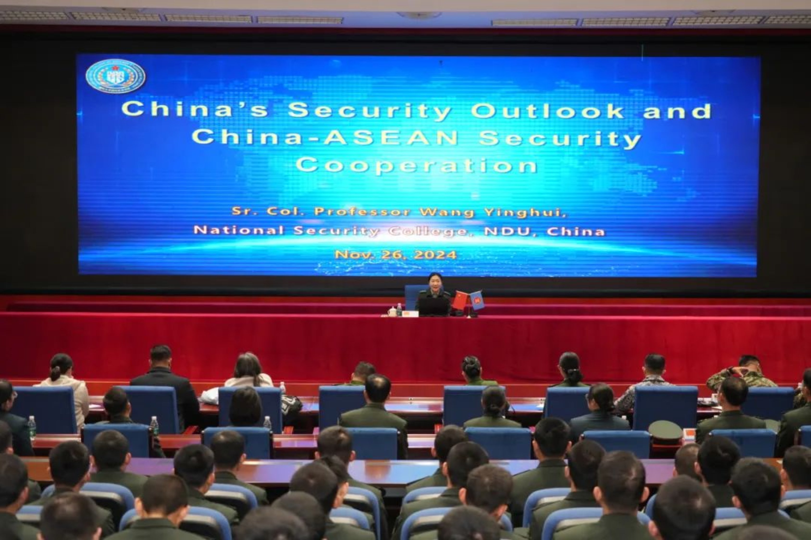 在国防科大外国语学院学术报告厅,参访团成员聆听了《中国的安全观与中国—东盟安全合作》、《和平共处五项原则与构建人类命运共同体》等专题讲座,围绕中国同东盟国家共建“一带一路”等议题,与中方师生开展热烈讨论。