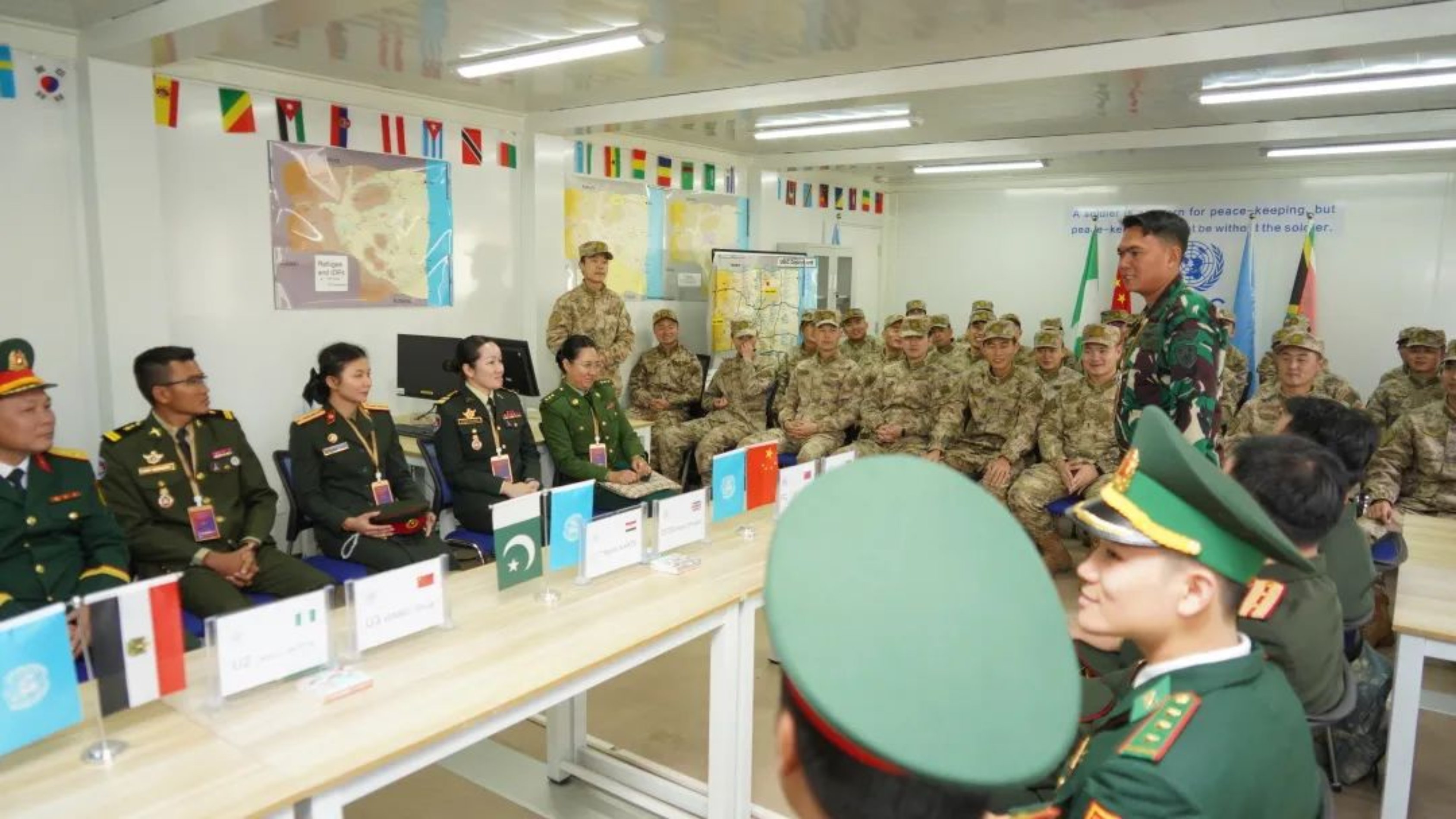 在学院维和综合演练基地,参访团成员详细了解学院承担综合性维和任职培训任务情况以及学院建设国际维和学科专业新体系的各项措施,并与学院维和班的学员进行友好交流。