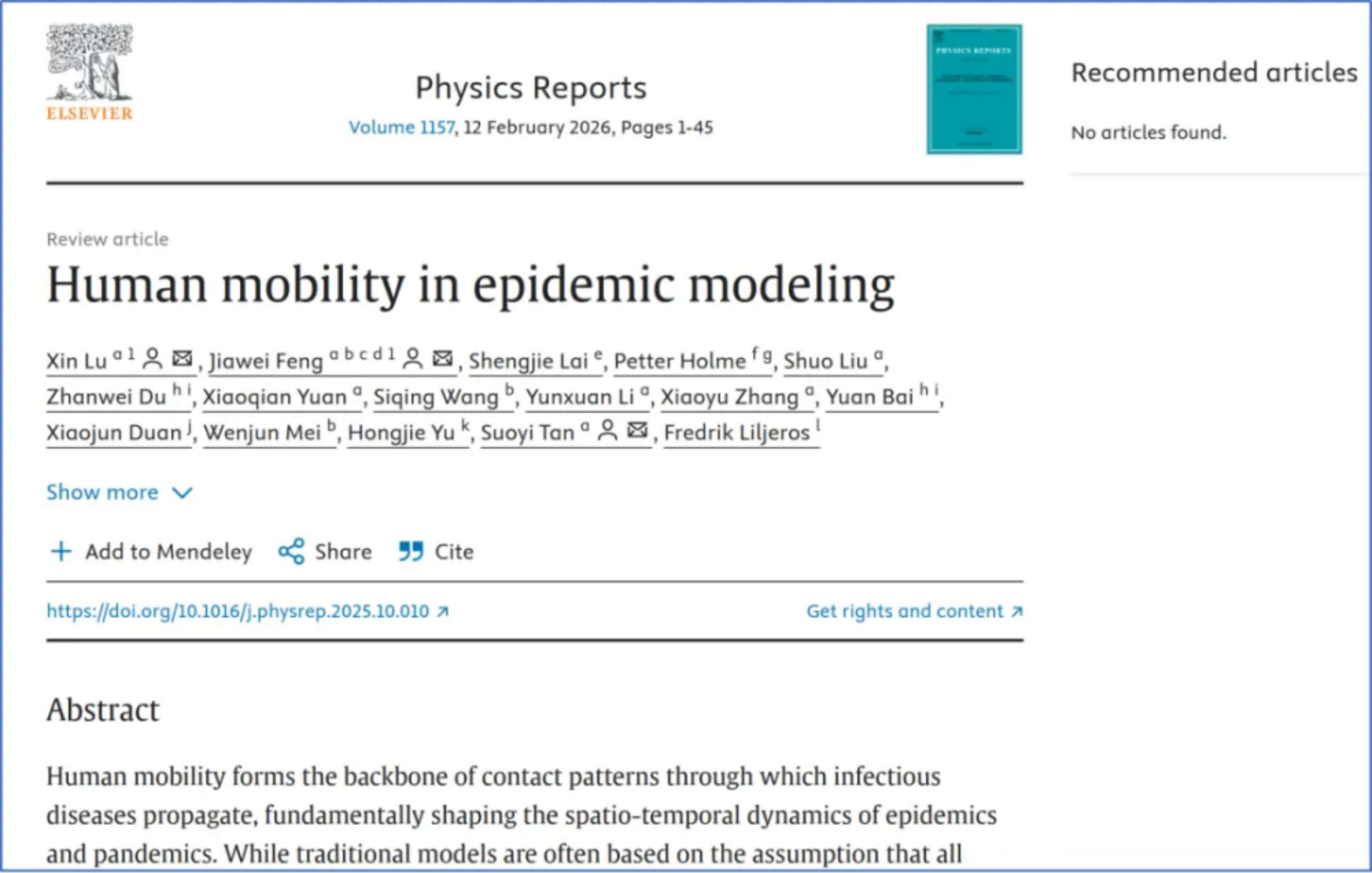 近日,国防科技大学系统工程学院教授吕欣和理学院教授段晓君带领国内外合作团队完成的人类移动行为与流行病建模领域研究综述《Human Mobility in Epidemic Modeling》发表在物理学顶级期刊《Physics Reports》(最新影响因子IF=29.5)上。该研究系统介绍了人类移动与接触行为在传染病建模中的数据来源、主要传播模型、有效的干预政策,以及人工智能与复杂系统相结合的前沿应用。吕欣教授为论文的第一作者和通讯作者,研究生冯家伟为论文共同第一作者,副研究员谭索怡为论文共同通讯作者。