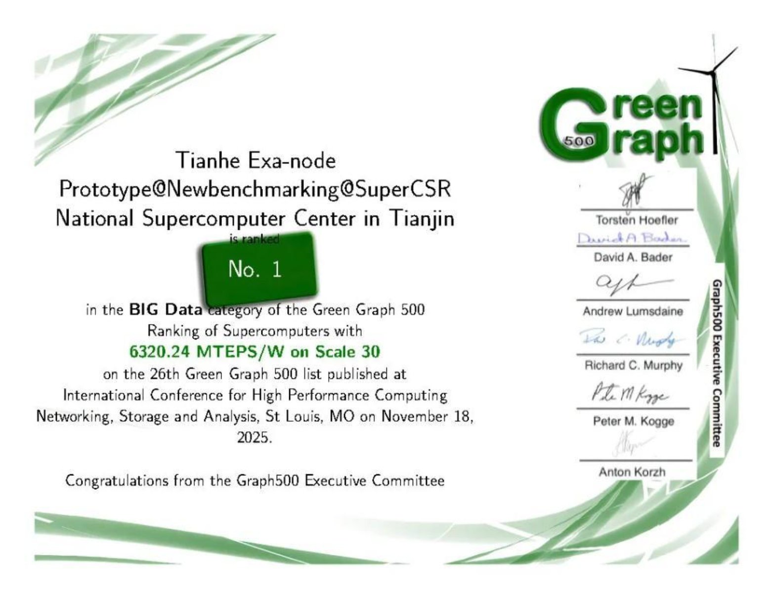 近日,国际权威超级计算机榜单Graph500最新结果正式公布,由国防科技大学计算机学院自主研制,部署于国家超级计算天津中心与长沙中心的国产主机系统,再获两项世界级荣誉——GreenGraph500大数据图计算能效世界第一与GreenGraph500小数据图计算能效世界第一,以硬核实力彰显中国超算的国际领先地位。