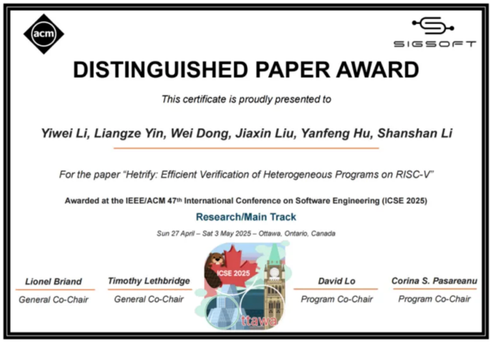 论文《Hetrify: Efficient Verification of Heterogeneous Programs on RISC-V》针对RISC-V架构提出一种基于指令级转换规则的通用验证方法,为操作系统及嵌入式系统的高可靠验证提供了新型理论框架与技术路径。论文第一作者为博士生李义威,论文指导老师为尹良泽副教授、董威教授和李姗姗教授。