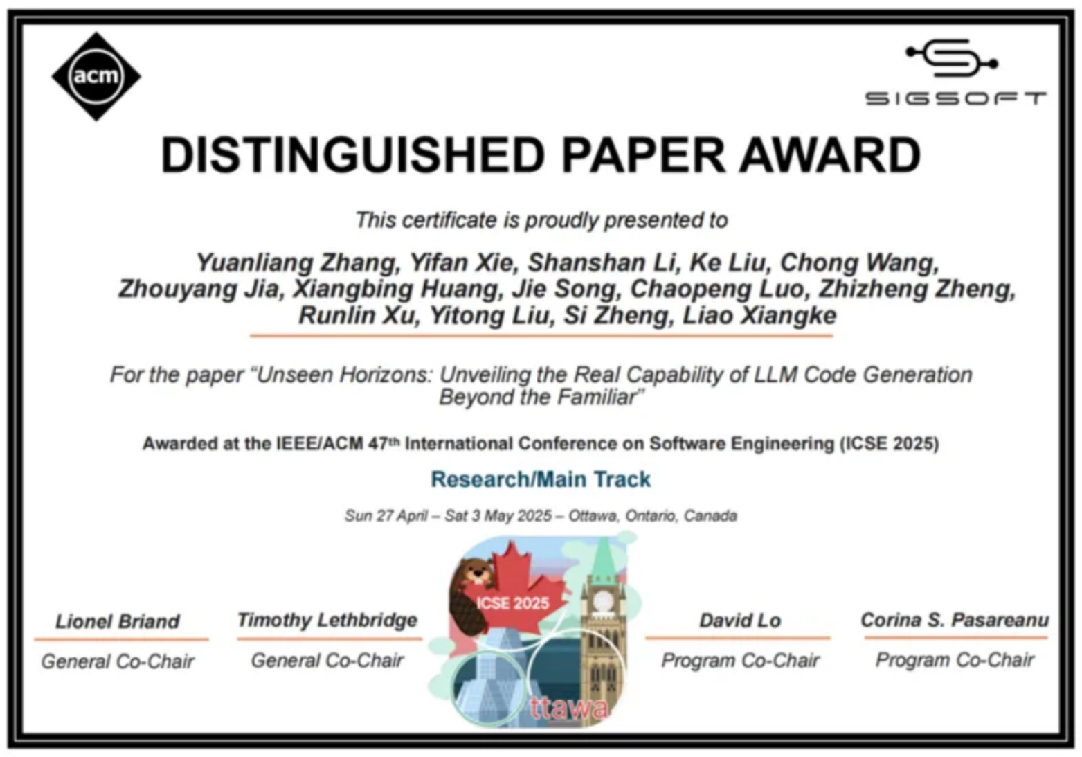 近日,第47届国际软件工程大会在加拿大举行。作为中国计算机学会(CCF)和国际计算机学科排名CSRankings双重认证的软件工程领域最具影响力的会议,ICSE每年仅为约5%的录用论文颁发ACM SIGSOFT杰出论文奖,以表彰其在技术创新和学术贡献方面的卓越表现。本届大会上,国防科技大学计算机学院某团队共有3篇论文同时获此殊荣,成为首个在一届会议中入选超过3篇杰出论文的高校单位。