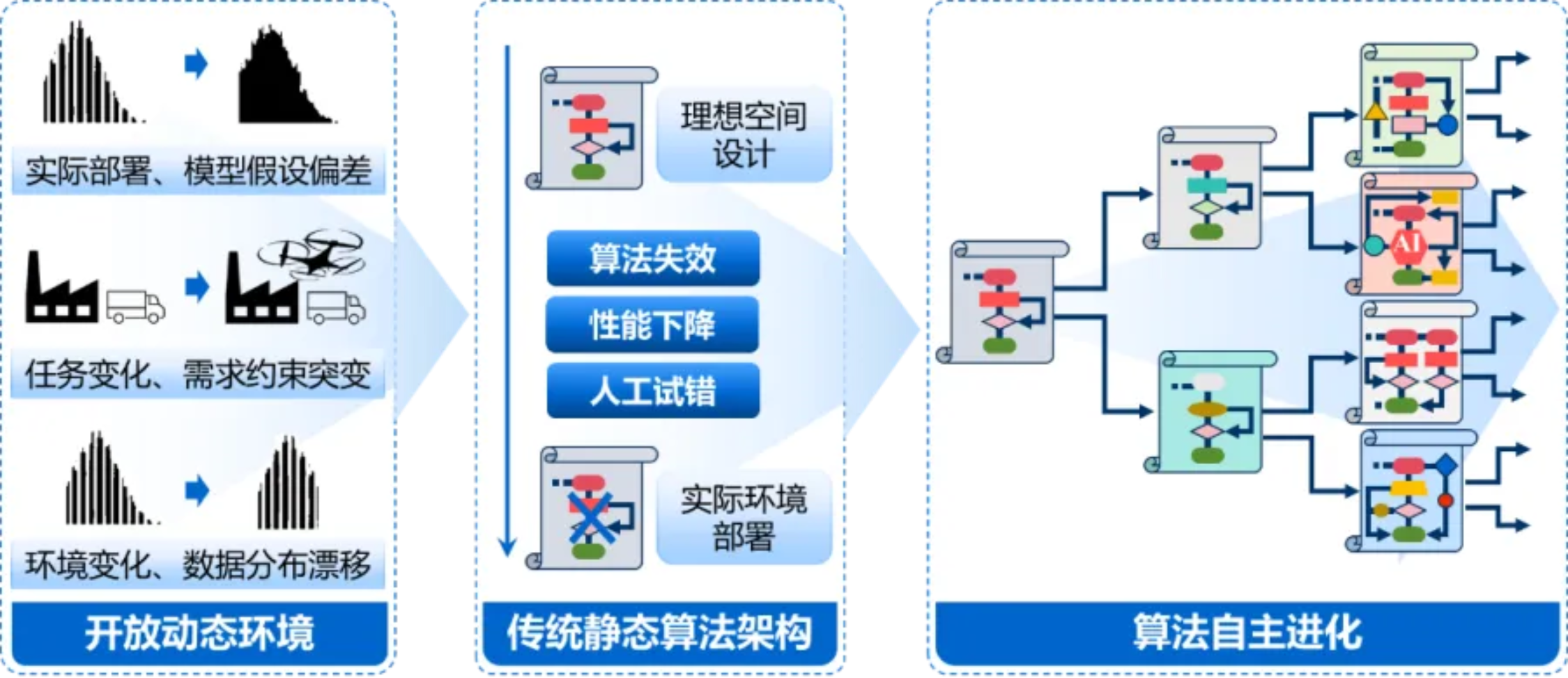 算法是人工智能的核心基石,当前,人工智能领域面临的关键挑战之一,即是静态算法架构与动态应用需求之间存在根本性矛盾。围绕国家新一代人工智能发展规划战略,项目聚焦军事指挥决策中任务规划算法面临的性能瓶颈,针对开放动态环境下算法适应性弱、迭代效率低等核心问题,开展面向开放动态环境的智能算法自主进化研究,旨在推动人工智能从“人工设计主导”向“系统自主演化”的范式转变,为防空反导等高实时性、强对抗性军事场景中的智能优化算法提供可演进、可扩展的架构级技术支撑。