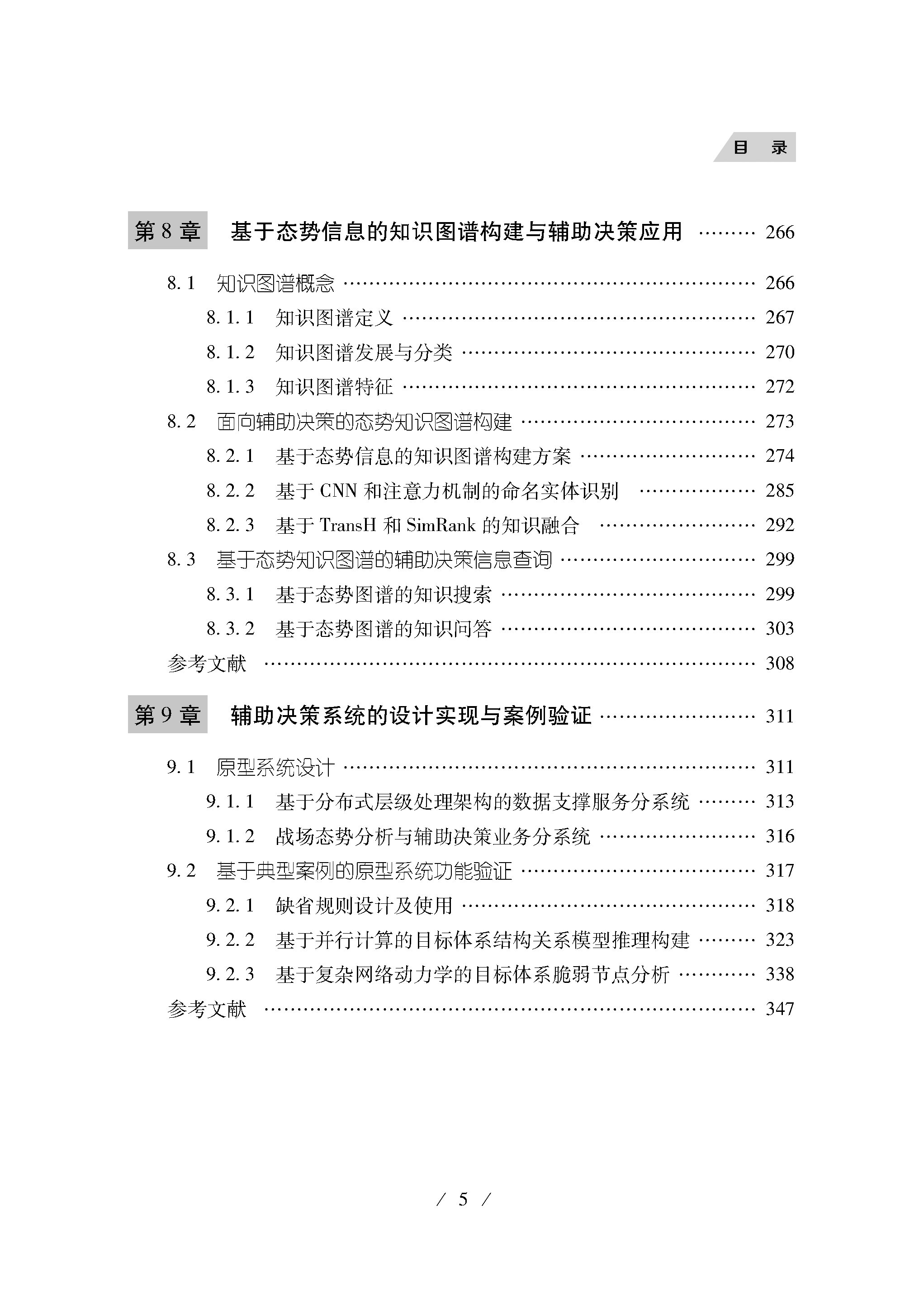 本书引入数据融合、逻辑推理、强化学习、复杂网络、知识图谱等新理论、方法,分9章展开分析研究。除第1章绪论和第9章原型系统设计与案例验证外,其余章节涵盖了态势信息挖掘、目标体系构建、目标体系分析及辅助决策三部分主体内容。各章节目录如下: