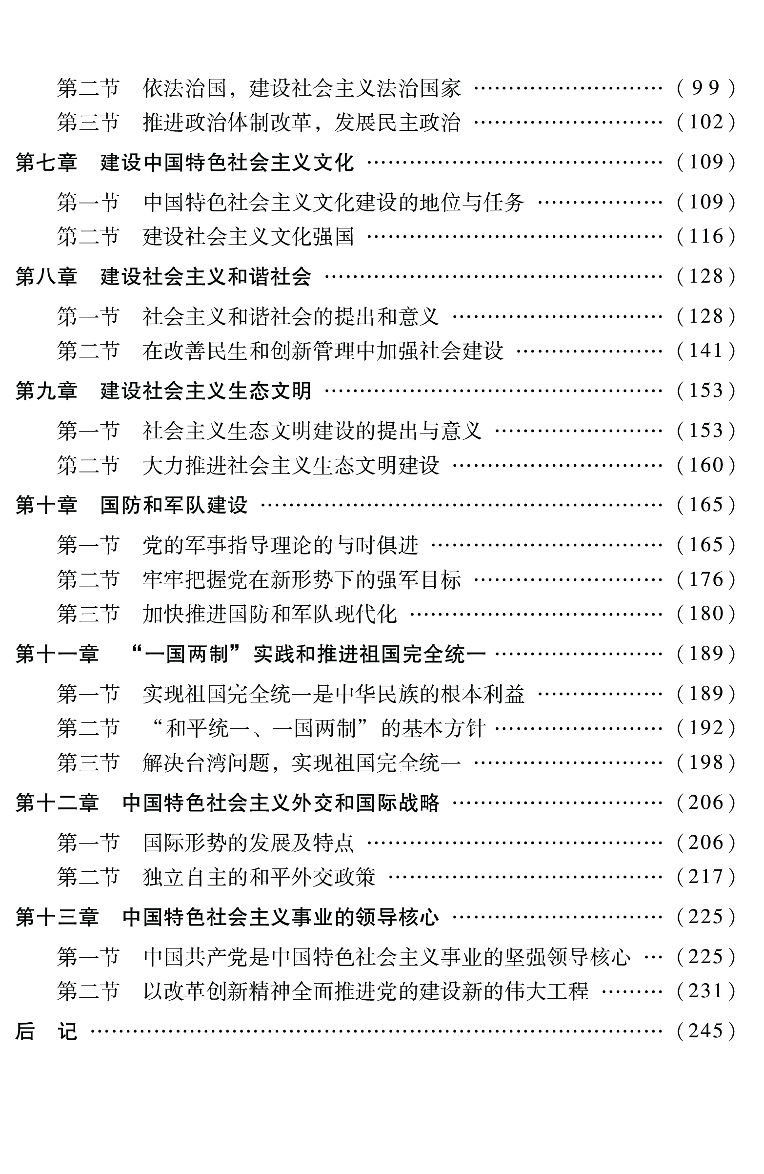 教材由十三章组成,共分为五个模块。其中概述篇(第一章),基本理论篇(第二章至第四章),总体布局篇(第五章至第九章),国防和军队篇(第十章),其它理论篇(第十一章至第十三章)。分别阐述了马克思主义中国化的最新成果、社会主义本质论、社会主义初级阶段论、社会主义改革开放论,系统介绍了中国特色社会主义“五位一体” 的总体布局,以及国防和军队建设、祖国统一事业、外交和国际战略、中国特色社会主义事业的领导核心等内容。