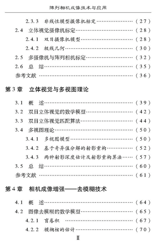 《阵列相机成像技术与应用》围绕阵列相机与多摄像机成像、图像处理和视觉计算等方面进行介绍,总结了作者在此领域的一些工作。全书可分为三部分,共11章。一部分为基础理论,包括第1章至第3章,其中第1章概述了阵列相机与多摄像相关典型系统和应用;第2章介绍摄像机标定方法;第3章介绍立体视觉和多视图相关理论和方法。第二部分为图像增强,主要关注于单摄像机图像增强以及基于多幅图像的相关计算方法,包括第4章至第9章,其中第4章介绍了图像去模糊方法;第5章介绍了图像去噪方法;第6章介绍了简单透镜成像增强方法;第7章介绍了图像拼接方法;第8章介绍图像超分辨率增强方法;第9章介绍了光场计算方法。第三部分为系统和应用,包括第10章至第11章,其中第10章介绍了多摄像机广域动态图像技术与应用;第11章介绍了多摄像机情形下人体姿态估计和跟踪技术。