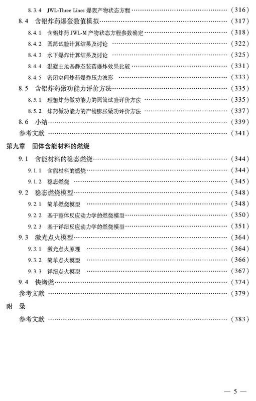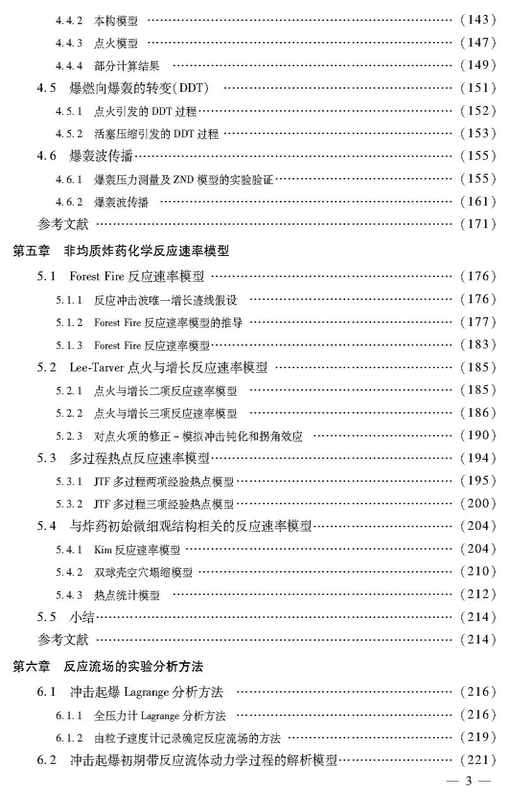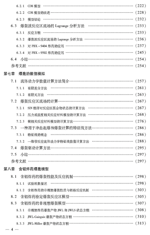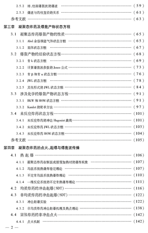 本书分为九章,第一章为爆轰波的CJ理论;第二章阐述了爆轰波的经典定常结构理论与ZND模型;第三章介绍了凝聚态炸药和爆轰产物的状态方程;第四章给出了与凝聚态炸药爆轰及安全性课题相关的实验结果、理论模型和定性结论;第五章介绍了几种常见、有影响的反应速率模型及其推导方法和基本物理概念;第六章讨论了反应流场的实验分析方法;第七章描述了冲击起爆和爆轰过程的宏观唯象数值模拟方法;第八章介绍了含铝炸药爆轰模型;第九章介绍了固体含能材料的燃烧。