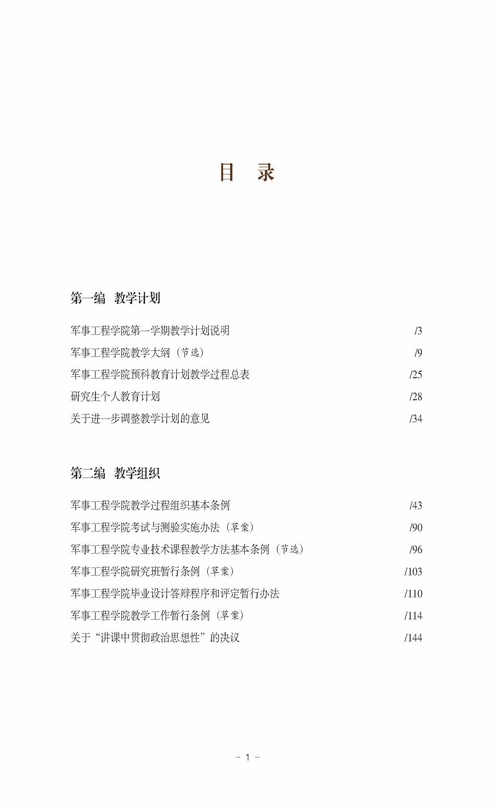 本书分教学计划、教学组织、教学经验三个专题,选编军事工程学院时期的教学档案文献26篇。第一编教学计划共5篇,主要为教学计划和教学大纲等档案文献;第二编教学组织共7篇,主要为教学组织相关制度的档案文献;第三编教学经验共14篇,主要为总结教和学两方面经验的档案文献。每一篇档案文献前设置“档案提要”,简要介绍档案的背景和主要内容。本书以彩页形式影印教学文书档案和照片档案,生动再现了“哈军工”教学工作场景,从档案文献角度反映了“哈军工”办学治校的优良传统和宝贵经验。