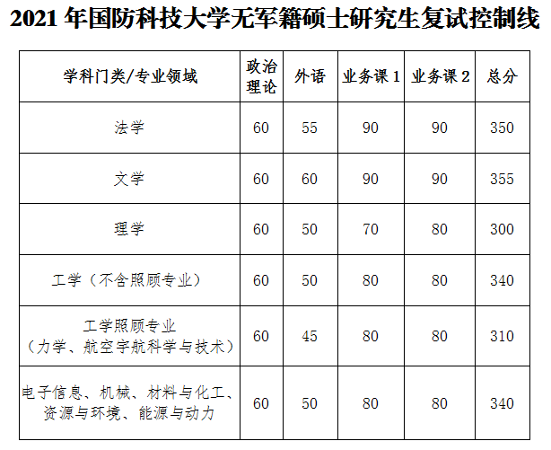 现公布国防科技大学2021年无军籍硕士研究生招生复试控制线,军人硕士研究生招生复试控制线待上级政策明确后公布。