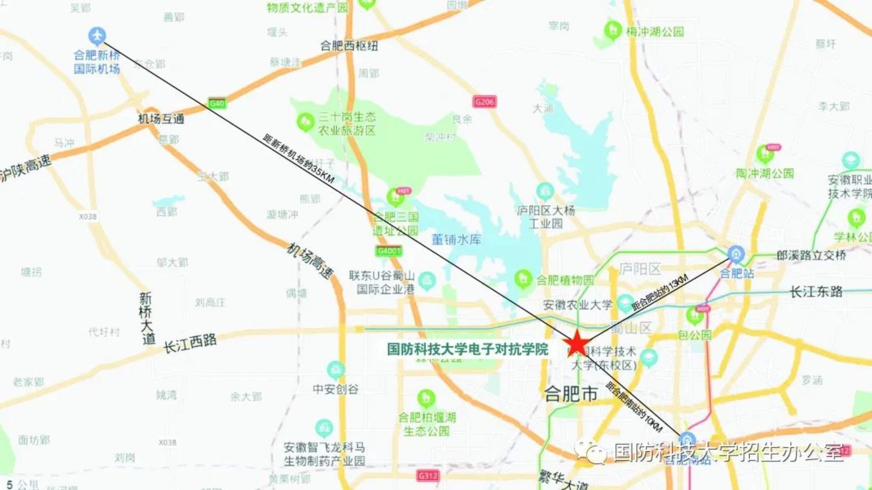 合肥新桥机场乘机场巴士至汽车客运西站,转乘2号线(往三十埠方向)至“西七里塘站”,转乘3号线(往幸福坝方向)至“国防科技大学站”下,5号口出。(全程约70分钟)