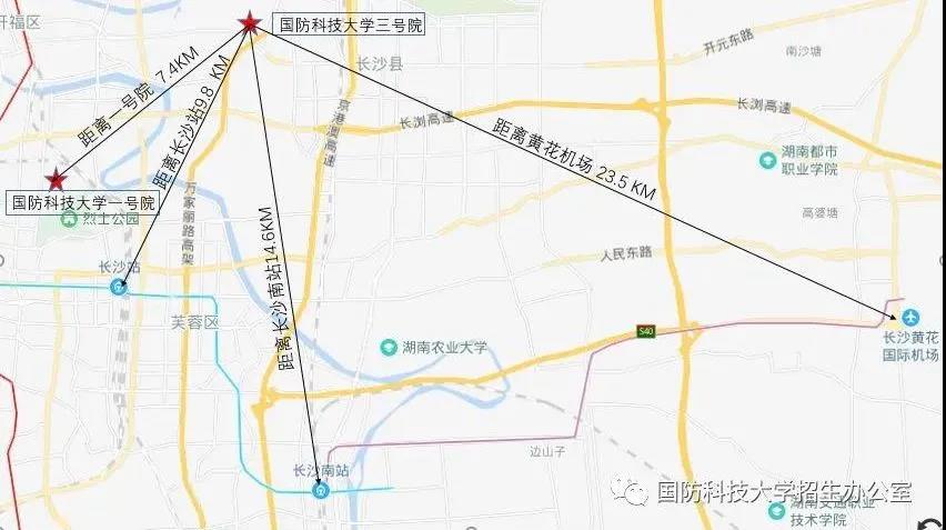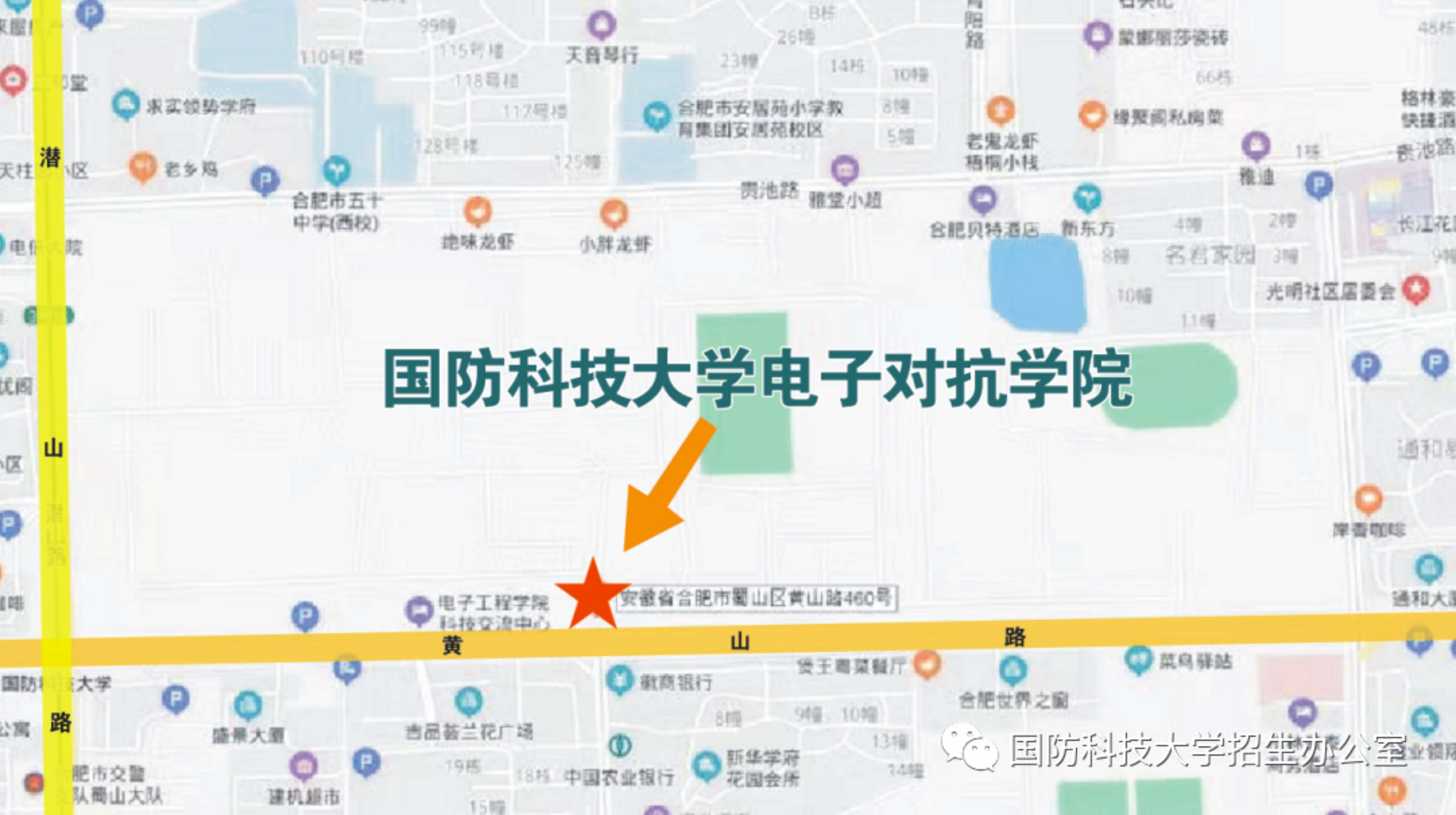 目的地:国防科技大学电子对抗学院(黄山路与石台路交口西北侧)。
