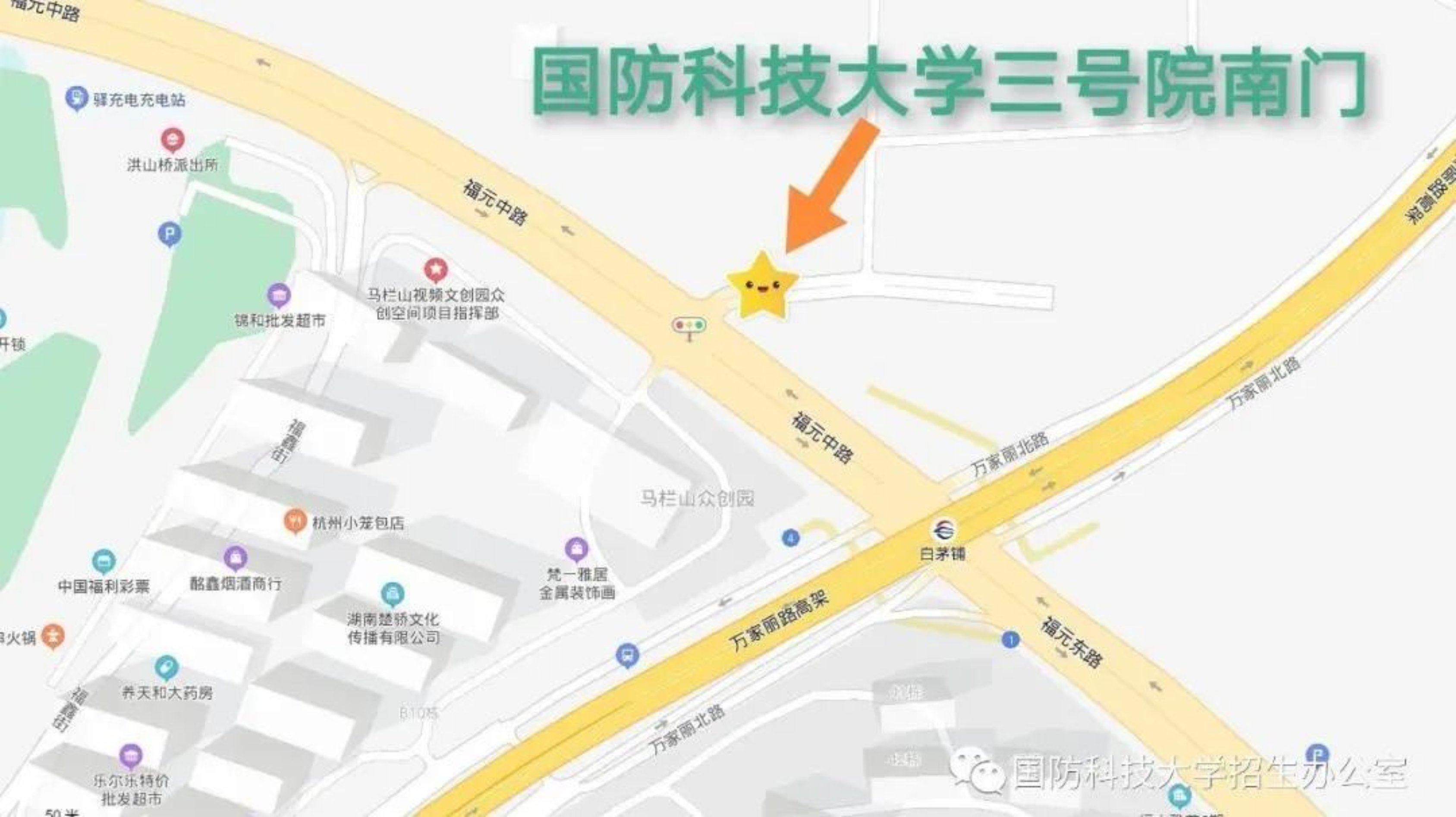 目的地:国防科技大学三号院南门停靠点(福元路与万家丽路交叉口西北侧)。