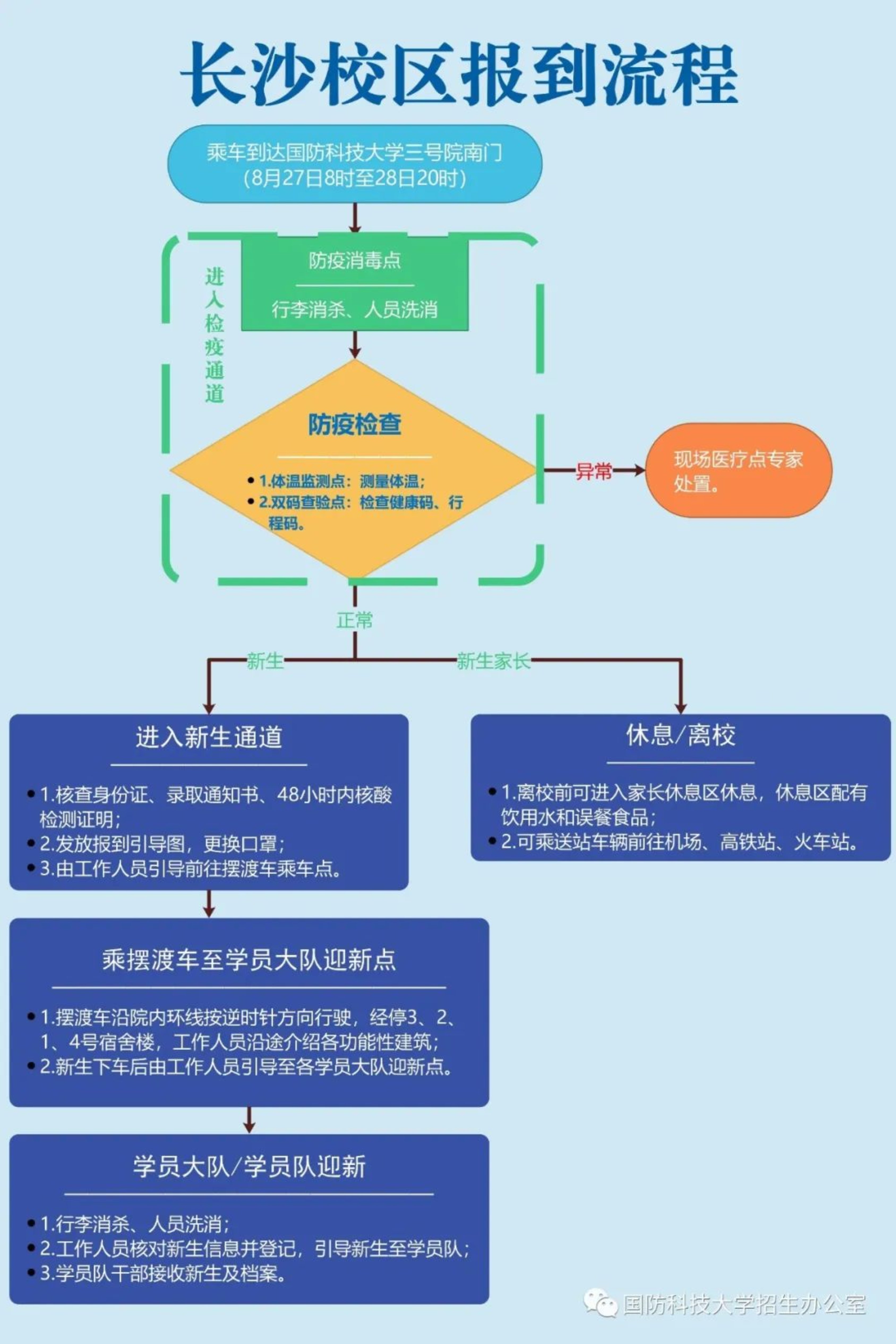 长沙校区在国防科大三号院南门(正门)设有迎新点,接待新学员与家长。