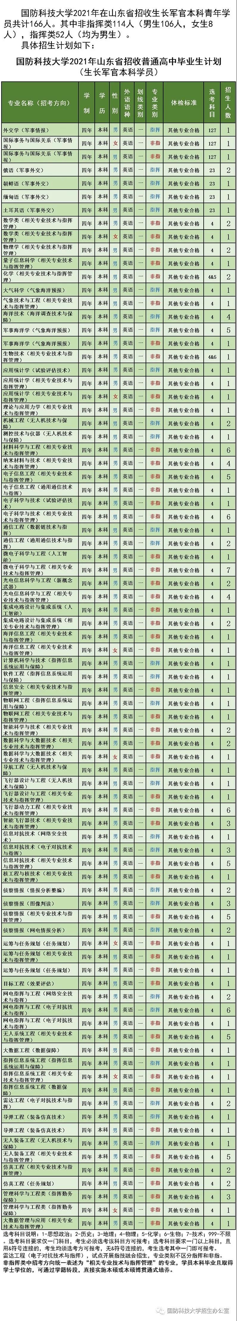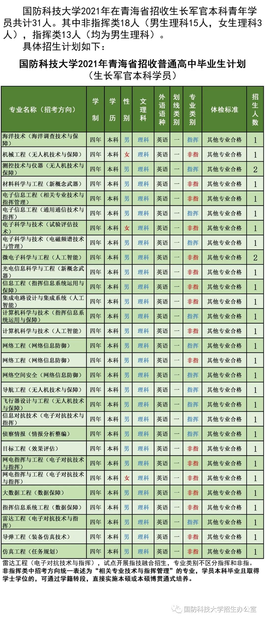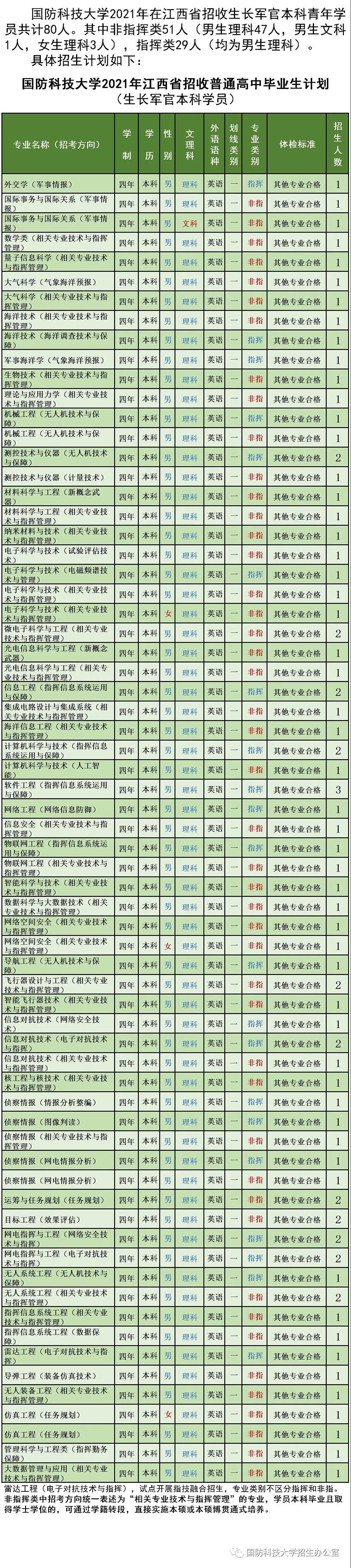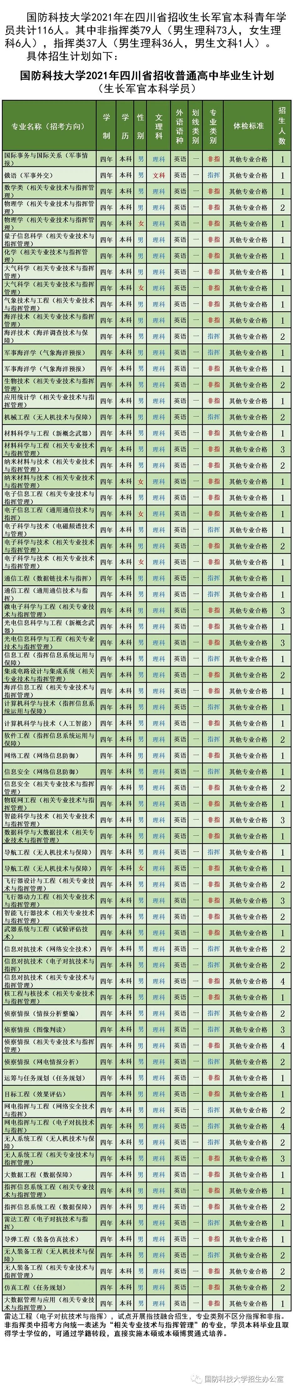 国防科技大学2021年在全国30个省份(市、自治区,下同)面向普通高中毕业生招收2400名生长军官本科学员。其中: