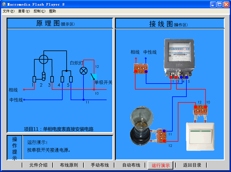 实验功能:通过实验,使学员进一步掌握照明电路、单相电度表的安装方法、布线方式及工作过程。连线结束后,进入运行演示界面观看演示结果:点击单极开关使之处于闭合状态,则可观察到日光灯发光,同时电度表开始计算所用电能;在白炽灯发光状态时,点击单极开关使之处于断开状态,可观察到白炽灯熄灭,同时电度表停止运转。其中功能界面如图26所示: