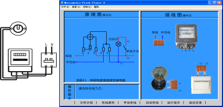 该实验要求学生依托Microdedia Flash Player8电工仿真软件进行仿真测试。通过单相电度表的安装电路了解单相电度表的接线原理以及照明电路的安装方式。可根据软件提供的操作提示进行实验操作。布线方式中手动布线方式只需先操纵鼠标选择手工操作,就可连接成真实的电路图,但如果接线错误则不能完成本次布线;自动布线方式适合于观看整个的布线过程,该方式采取一边在接线图区布线一边在原理图区动态显示相对应导线的方法进行演示,直观地展示了整个布线流程,有助于对实训内容的理解。当布线工作完成后即可操作运行演示功能。为了更快捷地对训练项目进行模拟,也可不经过布线这一环节直接操作运行演示功能进入模拟运行。其电度表连线原理和仿真界面如图25所示。