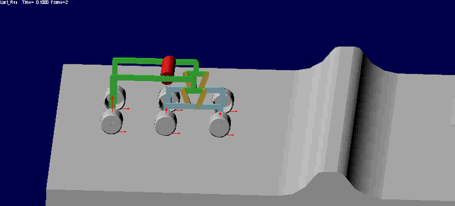 (3)基于所建立的虚拟样机和评价模型,进行机器人机械系统和控制系统的联合仿真,对机器人的运动学和动力学特性进行分析和虚拟试验,研究地面与轮系的相互作用力及其对机器人移动性能影响,研究机器人在复杂地形环境下的移动性能。