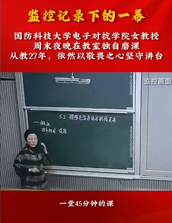 周末夜晚,国防科技大学电子对抗学院教授李晓霞在教室独自磨课,被监控拍下。从教27年,依然以敬畏之心坚守讲台。
