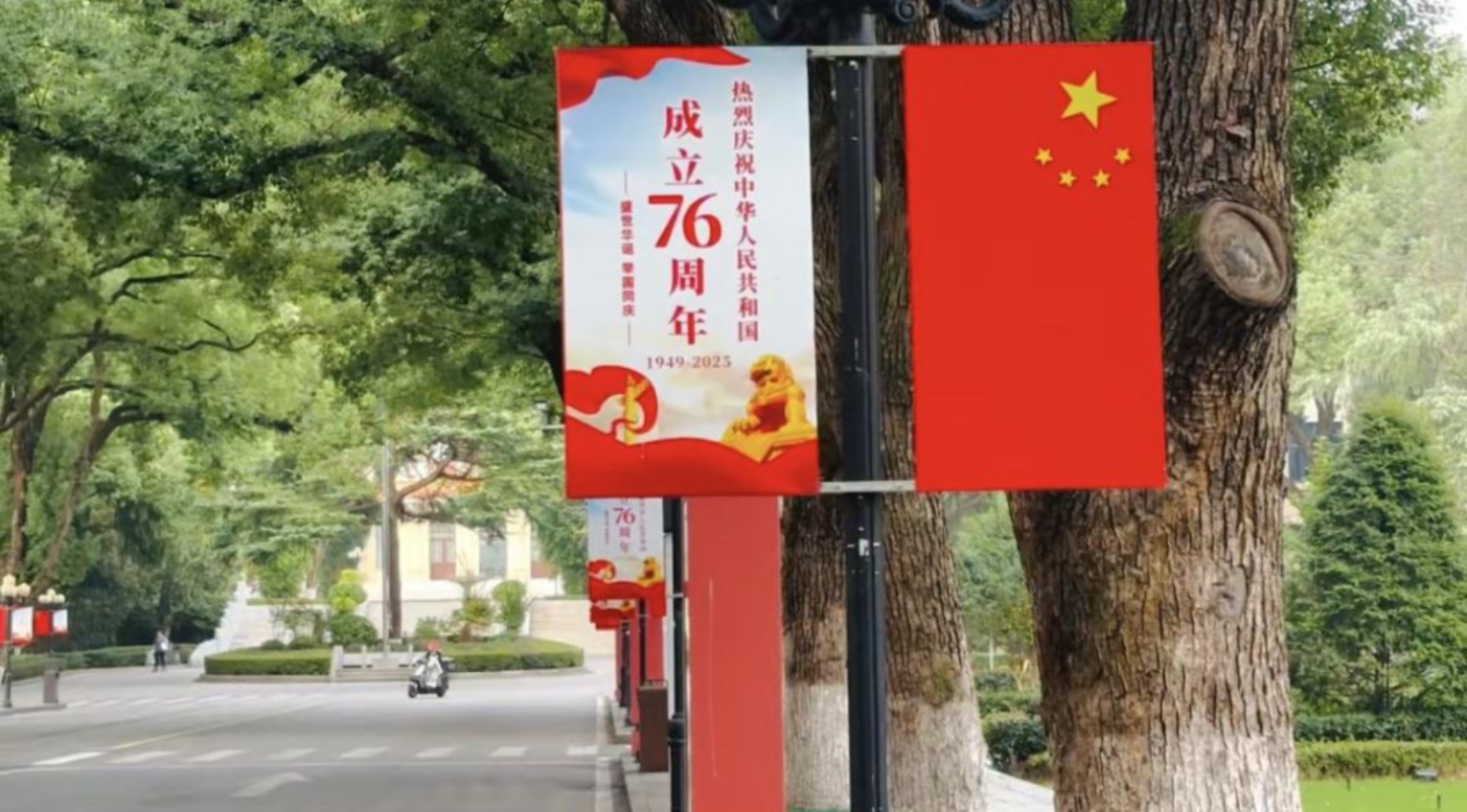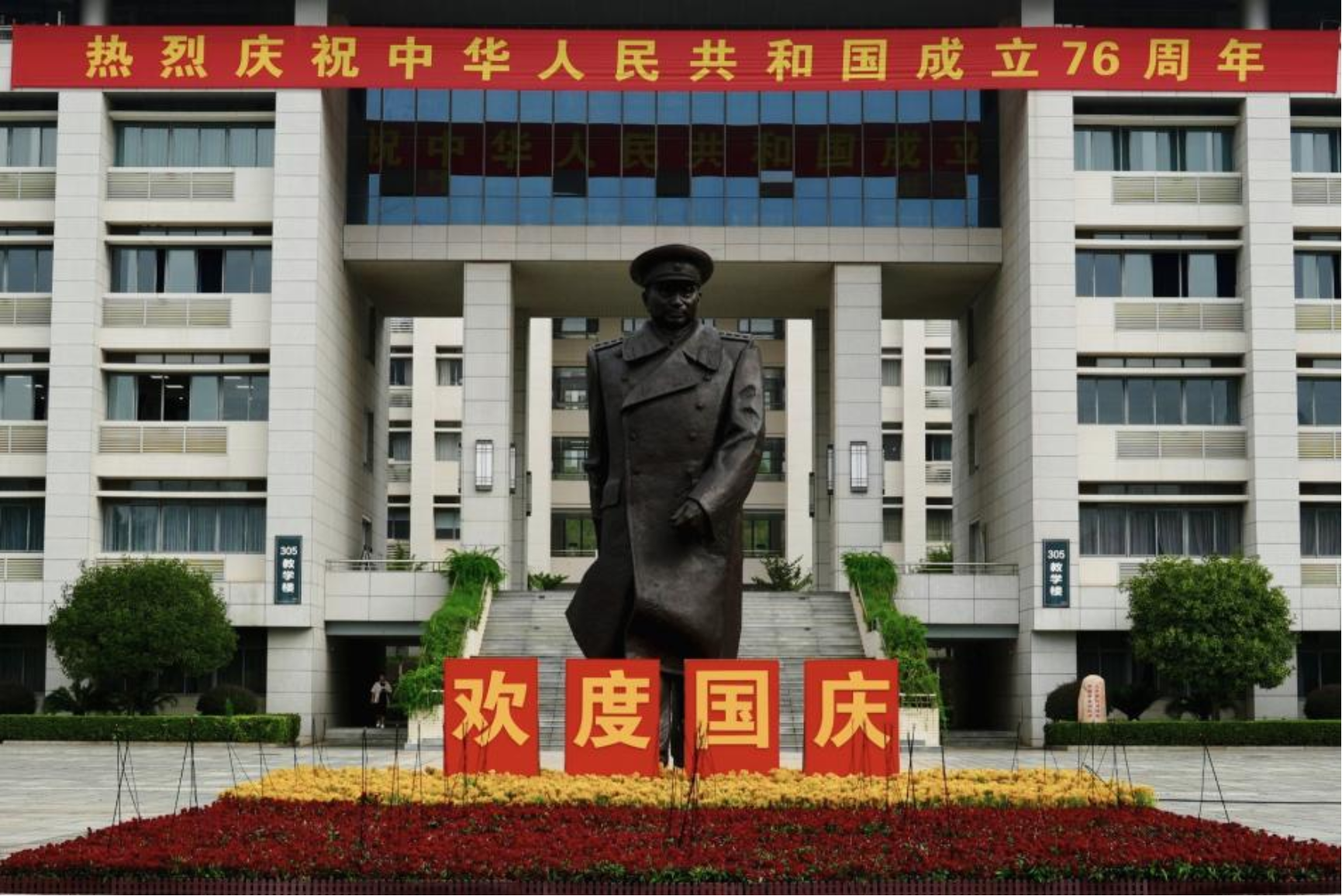 三号院内陈赓大将的铜像巍然矗立,305教学楼前,“热烈庆祝中华人民共和国成立76周年”高悬,与“欢度国庆”相映成辉。秋日暖阳将金辉嵌进每一笔横竖,似为共和国七十六载春秋镀一层庄严光边。
