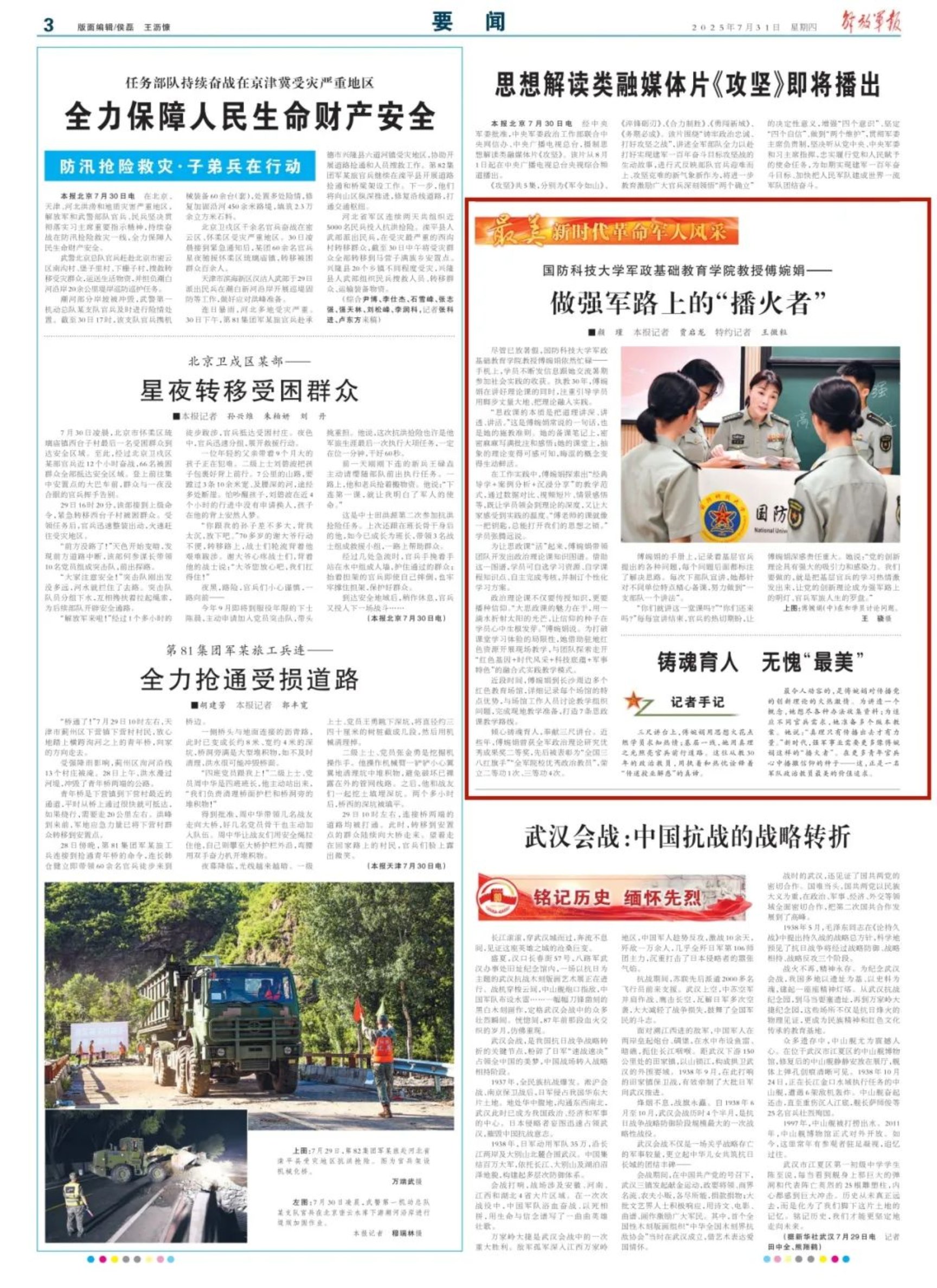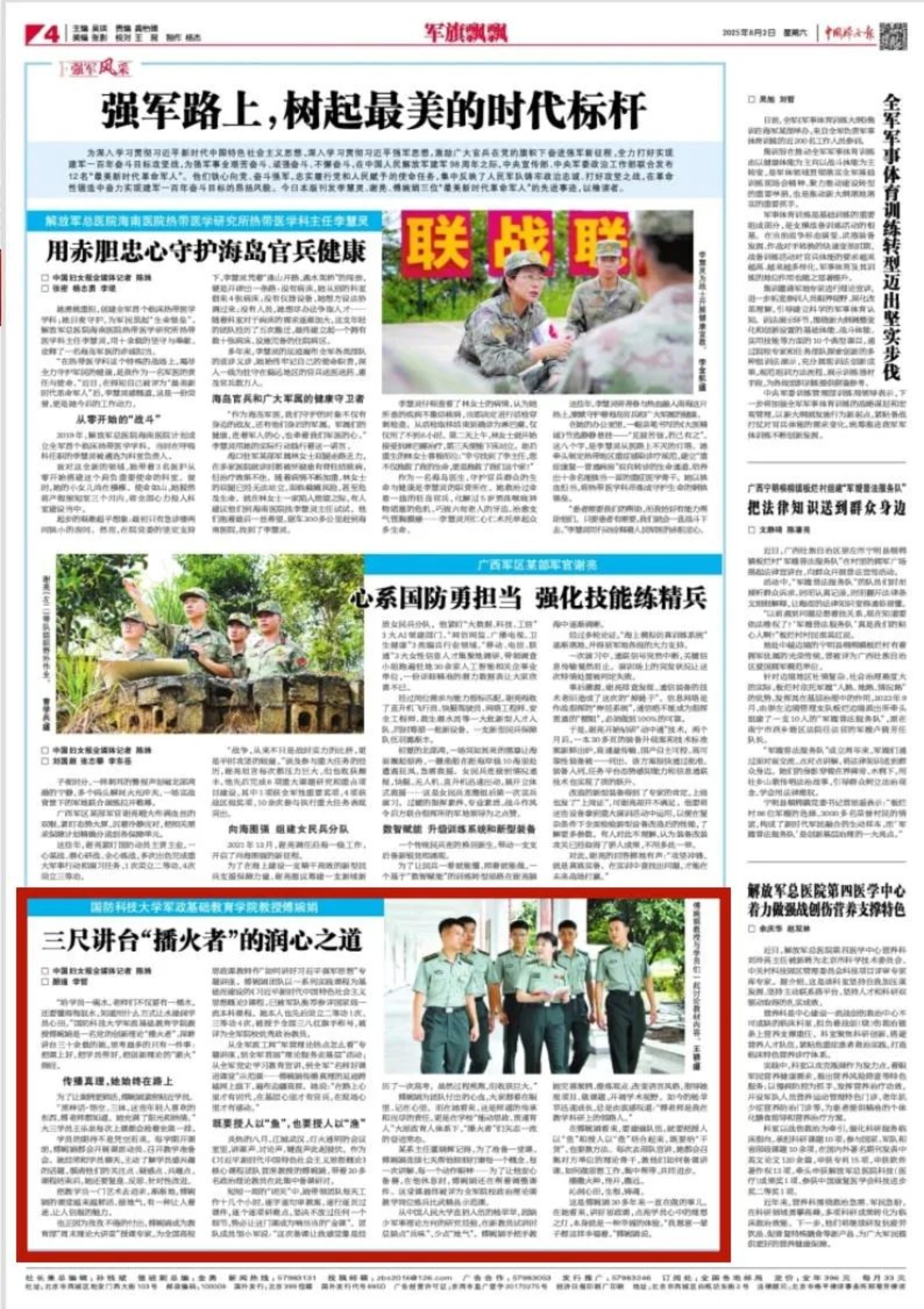 连日来,“最美新时代革命军人”、国防科技大学军政基础教育学院教授傅婉娟让思政教育“薪火相传”的先进事迹,经多层次、多角度、全媒体的立体化报道,“刷屏”网络、“刷爆”朋友圈,在中央级媒体、省市级媒体、重要行业媒体和国防科技大学“高地号角”融媒体矩阵发稿30余篇,总阅读量、播放量、互动量近千万,引发持续热议。这场聚焦“最美”的宣传,生动彰显了榜样的强大感召力。