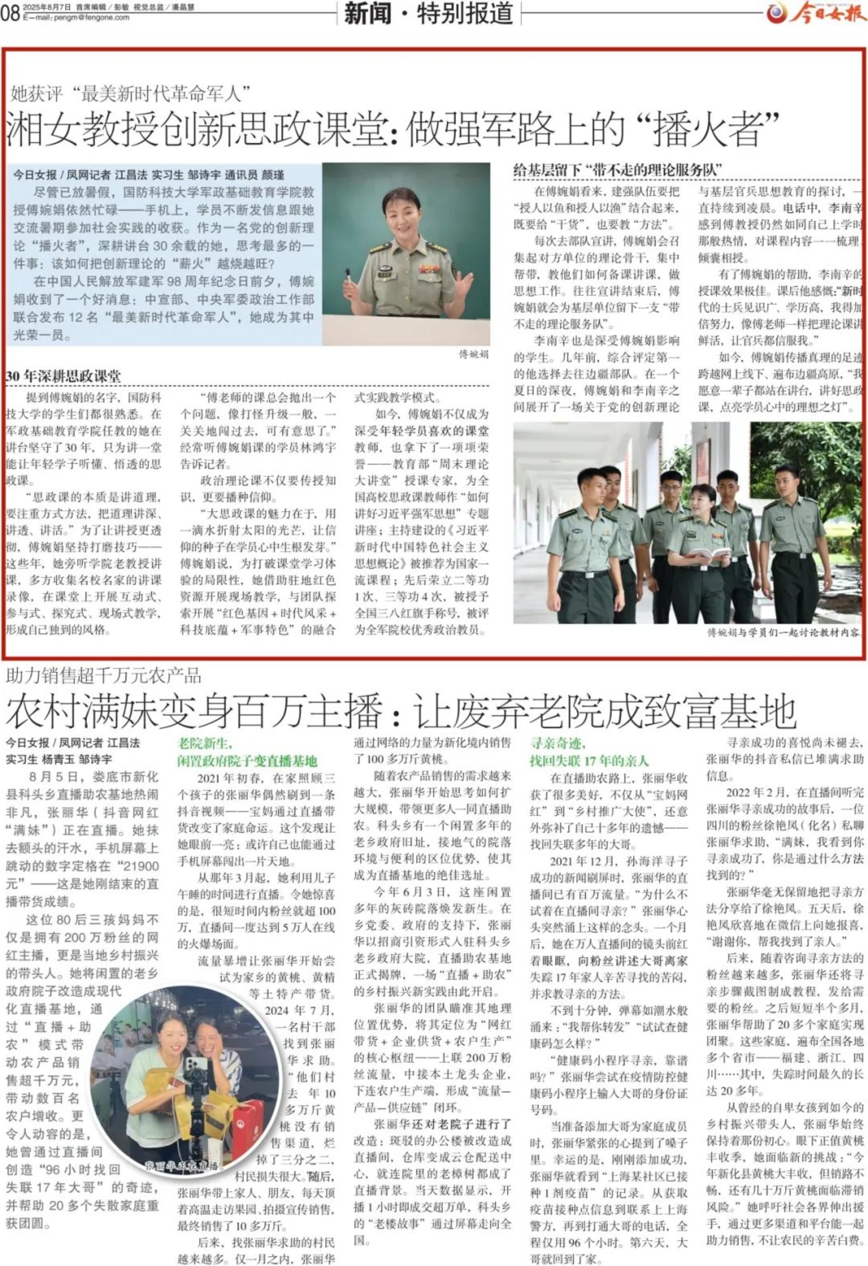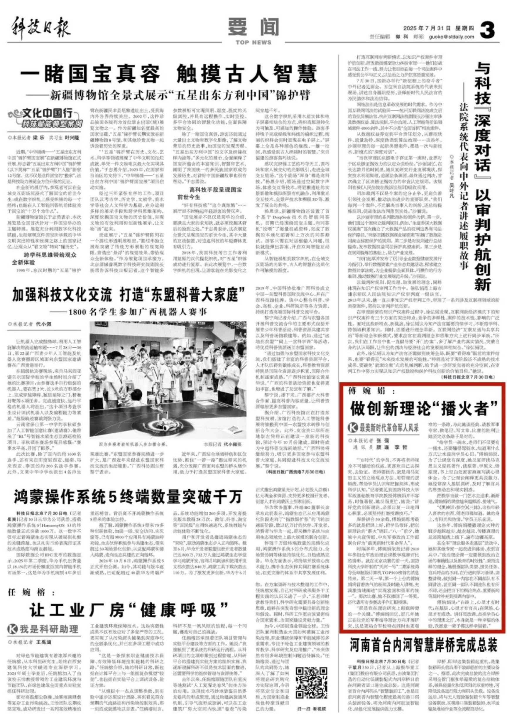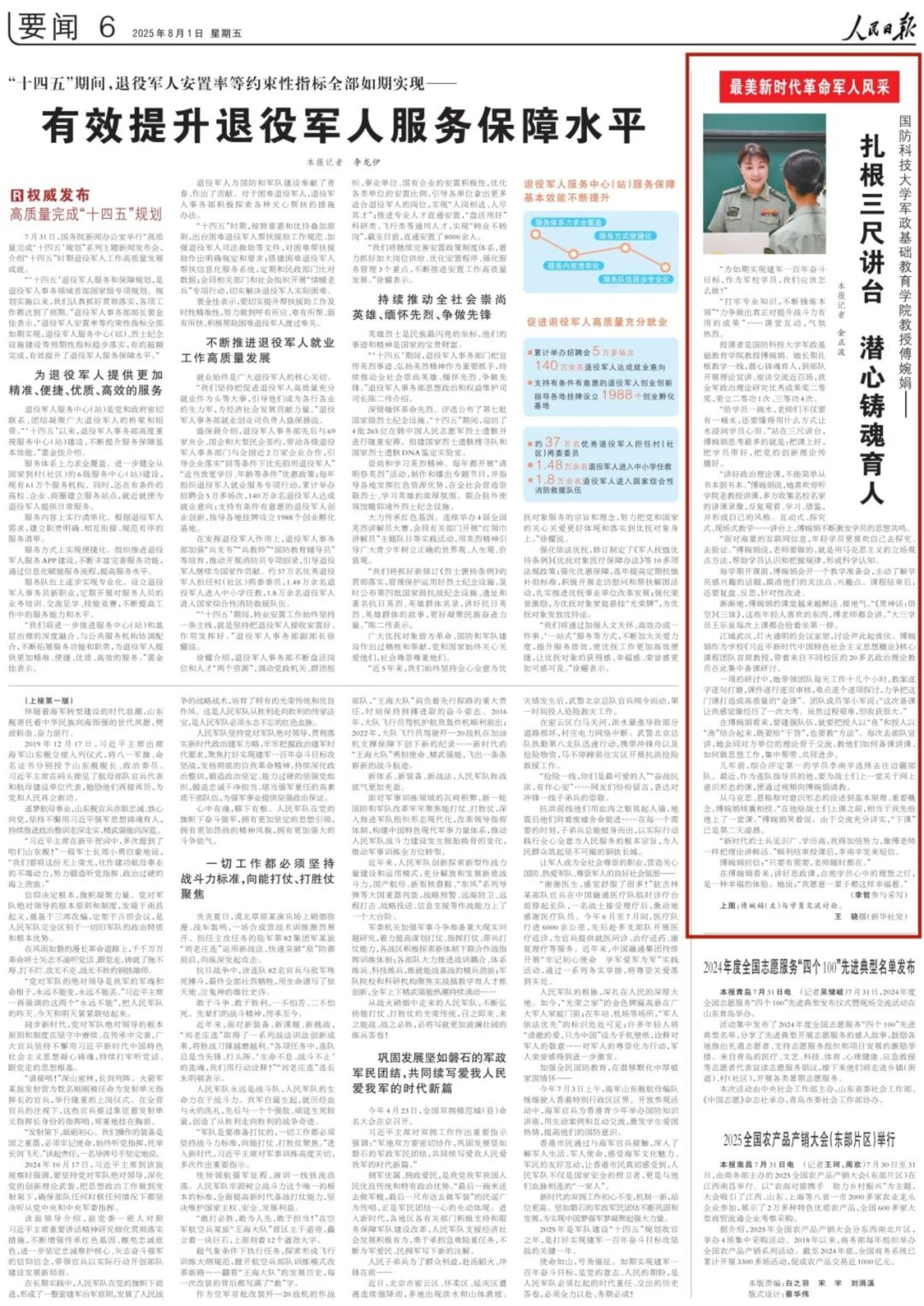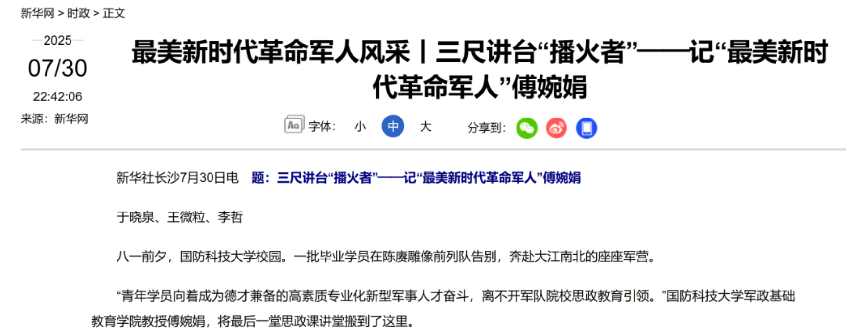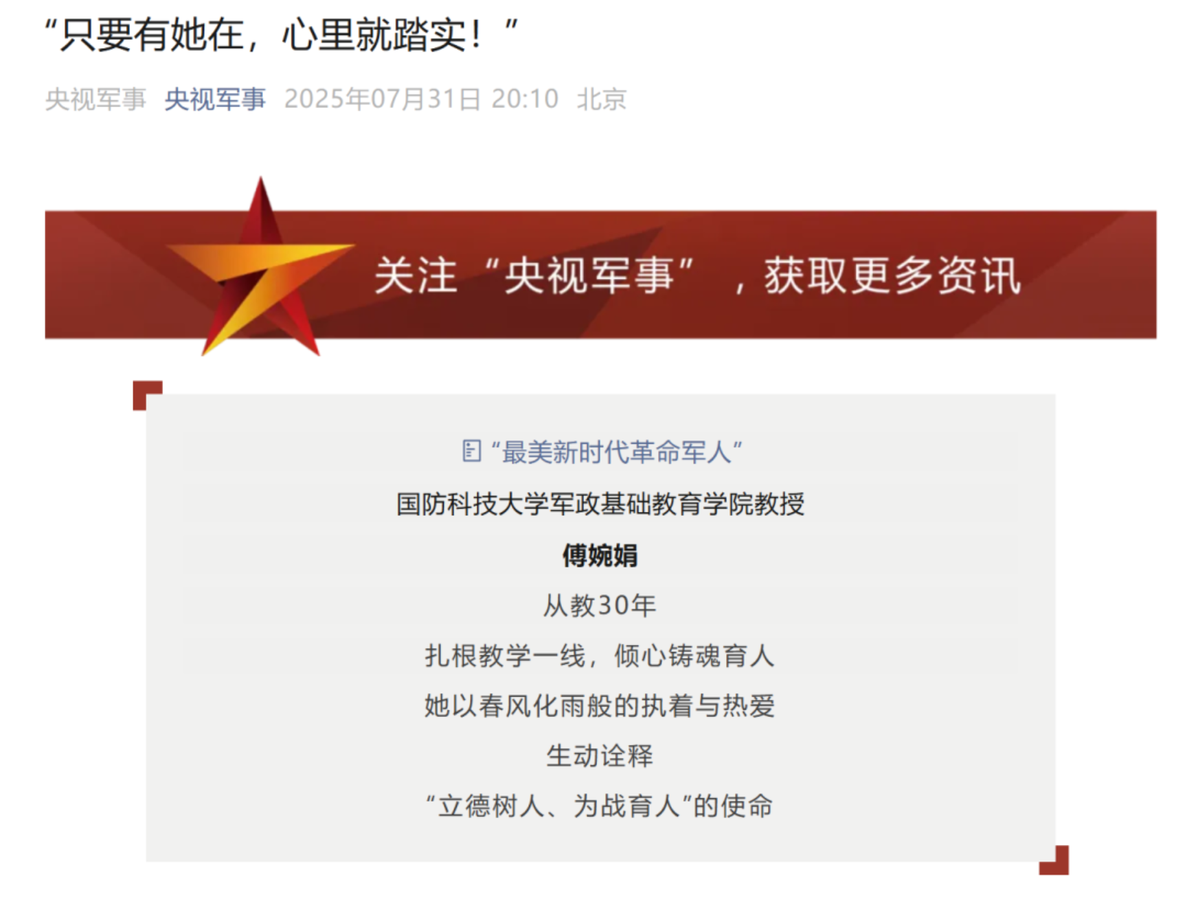 10余家中央媒体广泛开展宣传报道,涵盖网上网下、军地平台,傅婉娟教授“播火者”形象引发热议,典型示范引领作用发挥明显。