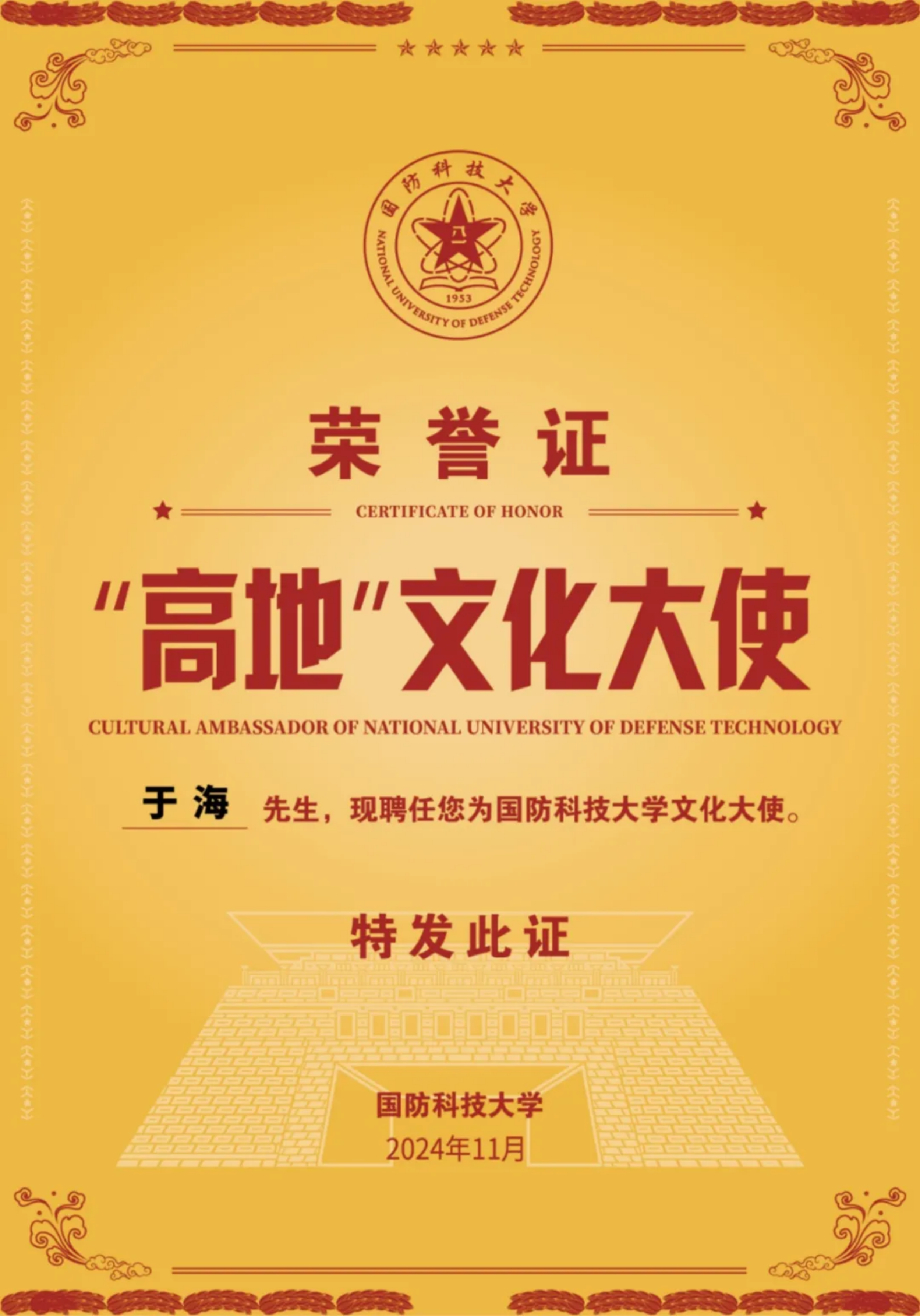 为深入贯彻落实中央军委办公厅印发的《繁荣发展强军文化实施纲要》,聚力打造学校“高地”文化品牌,11月19日下午,国防科技大学“高地”文化大使颁授仪式在长沙校区三号院音乐厅举行,学校政委陈国强为中国人民解放军军乐团原团长、国家一级指挥于海颁发学校首位“高地”文化大使荣誉证书并讲话。