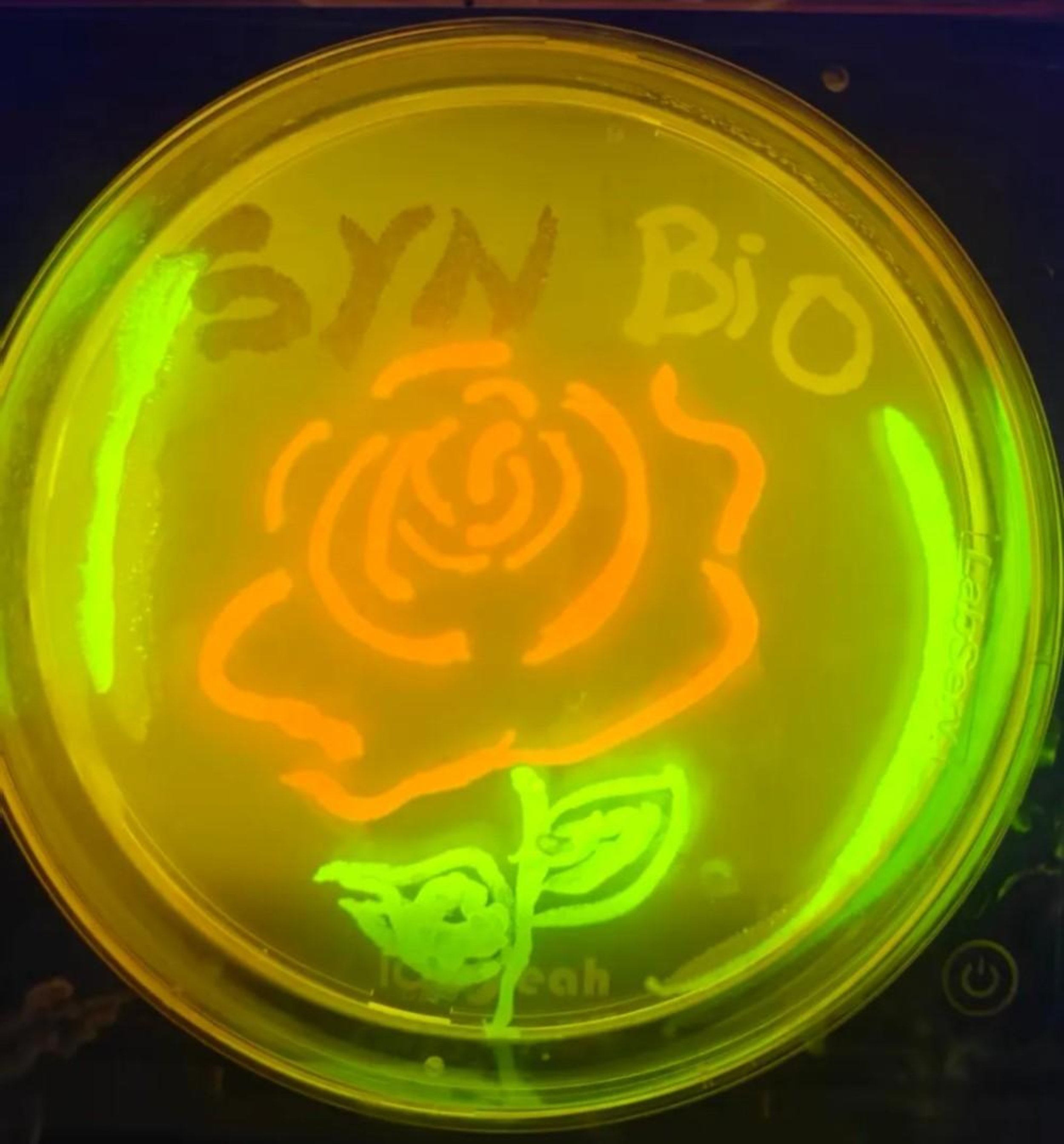 培养基上,橙红与荧绿的菌群交织成一朵盛放的玫瑰,这是合成生物学写给生命的浪漫情书。荧光细菌作笔、琼脂为纸,在培养皿中勾勒出纹样。在培养皿里,看不见的微生物变成发光的颜料,让科学与美学在微观世界里共生绽放。