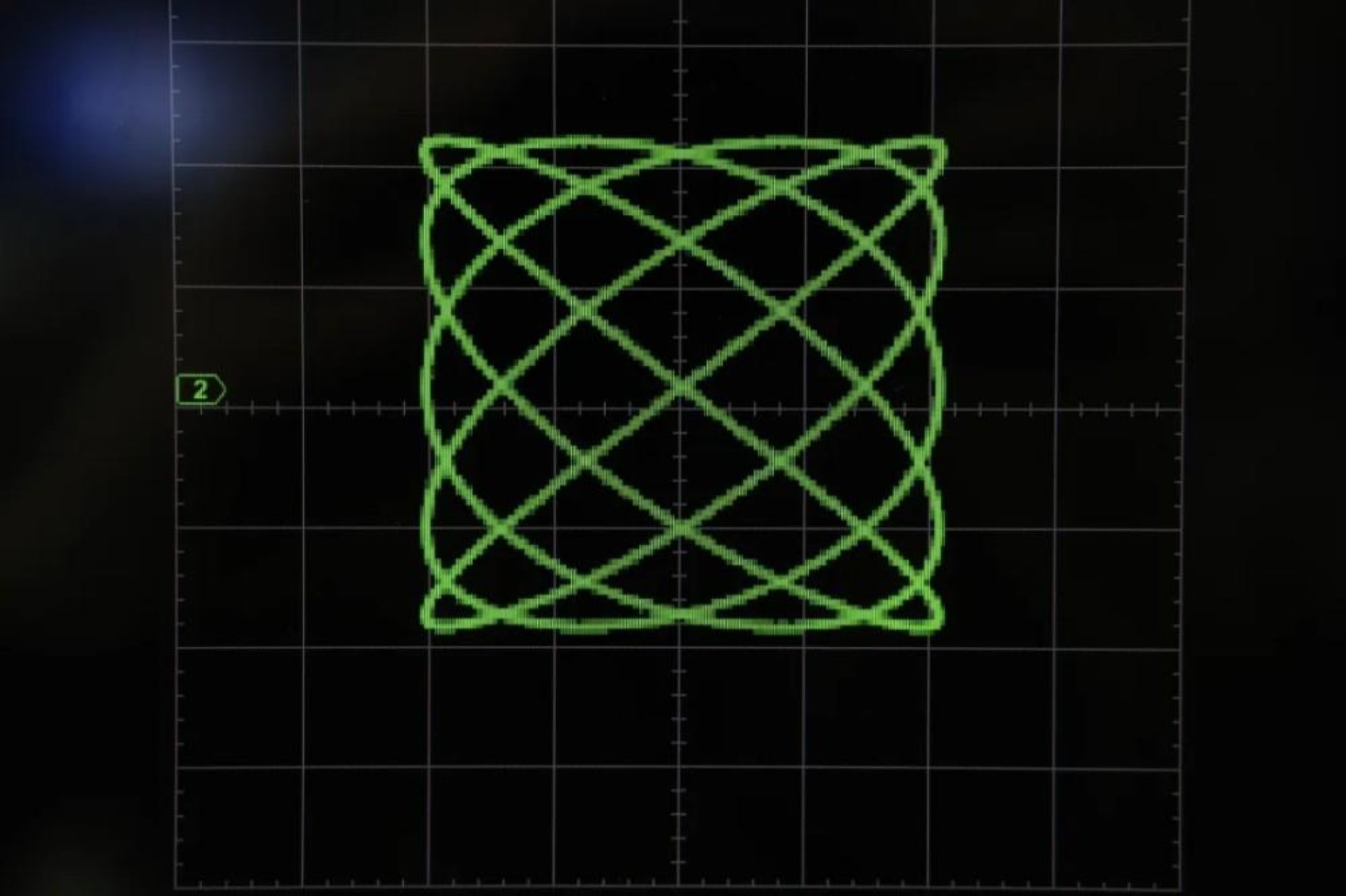 纯黑的网格背景之上,翠绿的线条交织出精密的几何纹样,这是两个正弦信号共振的视觉诗篇。正交的电信号在示波器上共舞,以固定频率编织出对称的菱形格纹,每一条曲线的弯折都对应着相位的协同与偏移。在示波器的网格里,看不见的电流被转化为可触摸的秩序,将抽象的频率、相位与振幅,无声诉说着振动与波的和谐韵律。