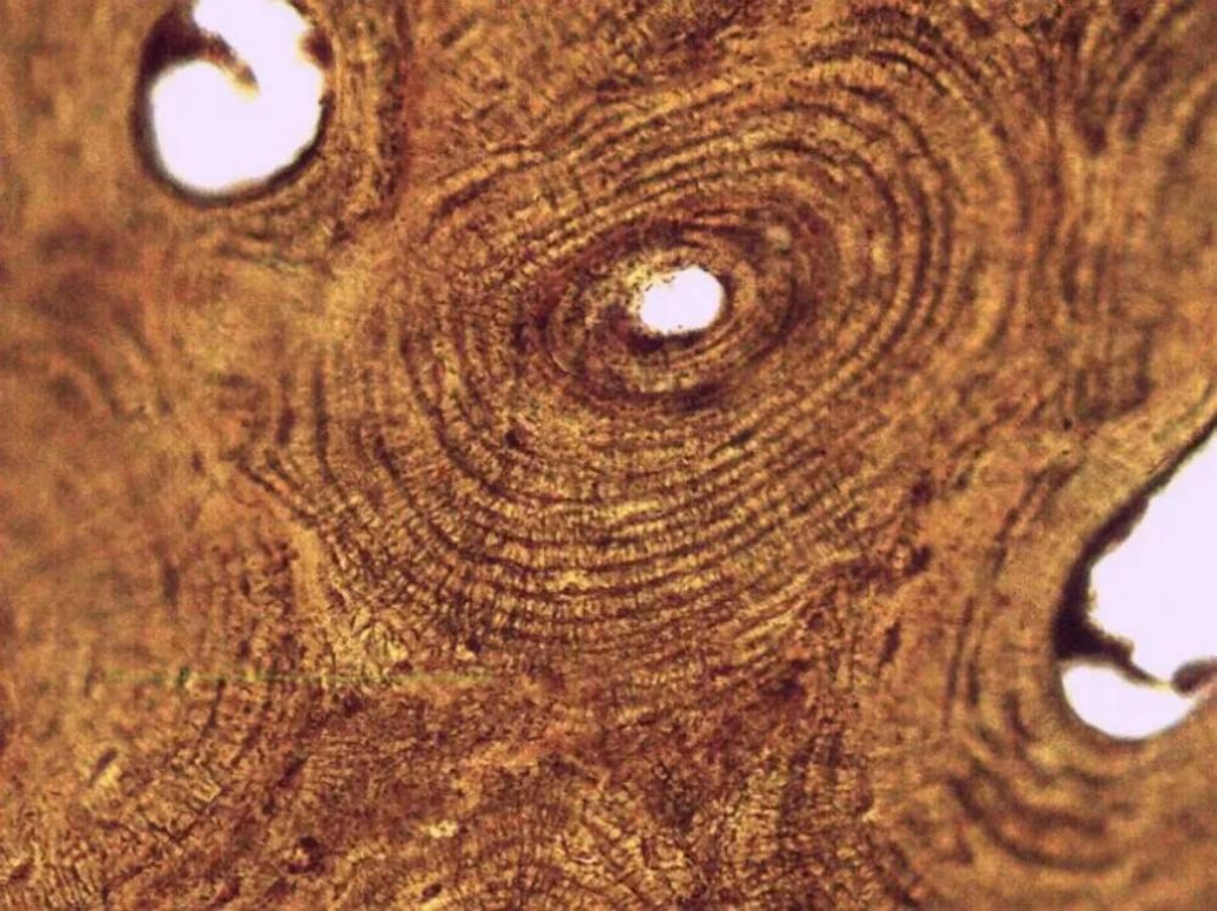 暖棕的骨质底色之上,层层同心圆纹理如年轮般环绕中央管铺展,这是骨骼的基本功能单位——哈弗斯系统。致密的骨板层是矿物质沉积的印记,中央的空白管腔是血管与神经穿行的通道,细密的骨陷窝与骨小管则在层间织成养分运输的网络。每一道环纹都记录着骨骼生长与重塑的岁月,在微米尺度里,将坚硬的骨质转化为可解读的生命年轮,既是机械支撑的结构基石,也是机体代谢与修复的微观见证。