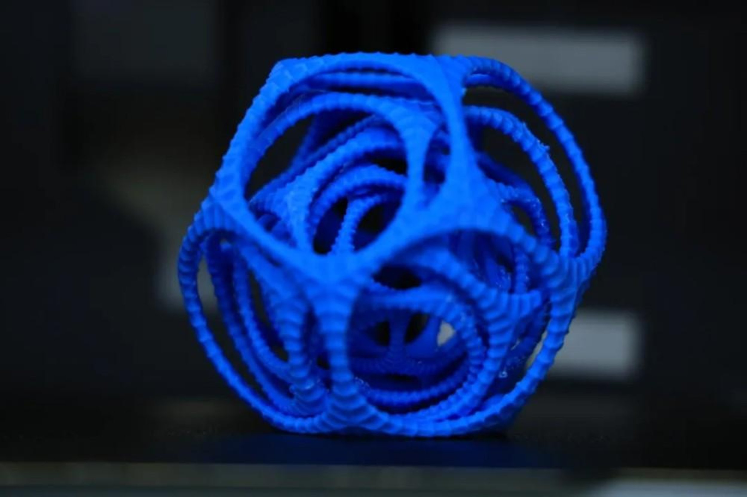 钴蓝色的塑料丝缕交织出一个通透而精密的立体结构,正多面体的骨架被拆解为环形镂空,层层嵌套的曲线既保留了结构的稳定,又最大化了空间的通透感。它将抽象的几何秩序转化为可触摸的实体,既是算法与工程的造物,也是理性美学在物理世界的具象表达。