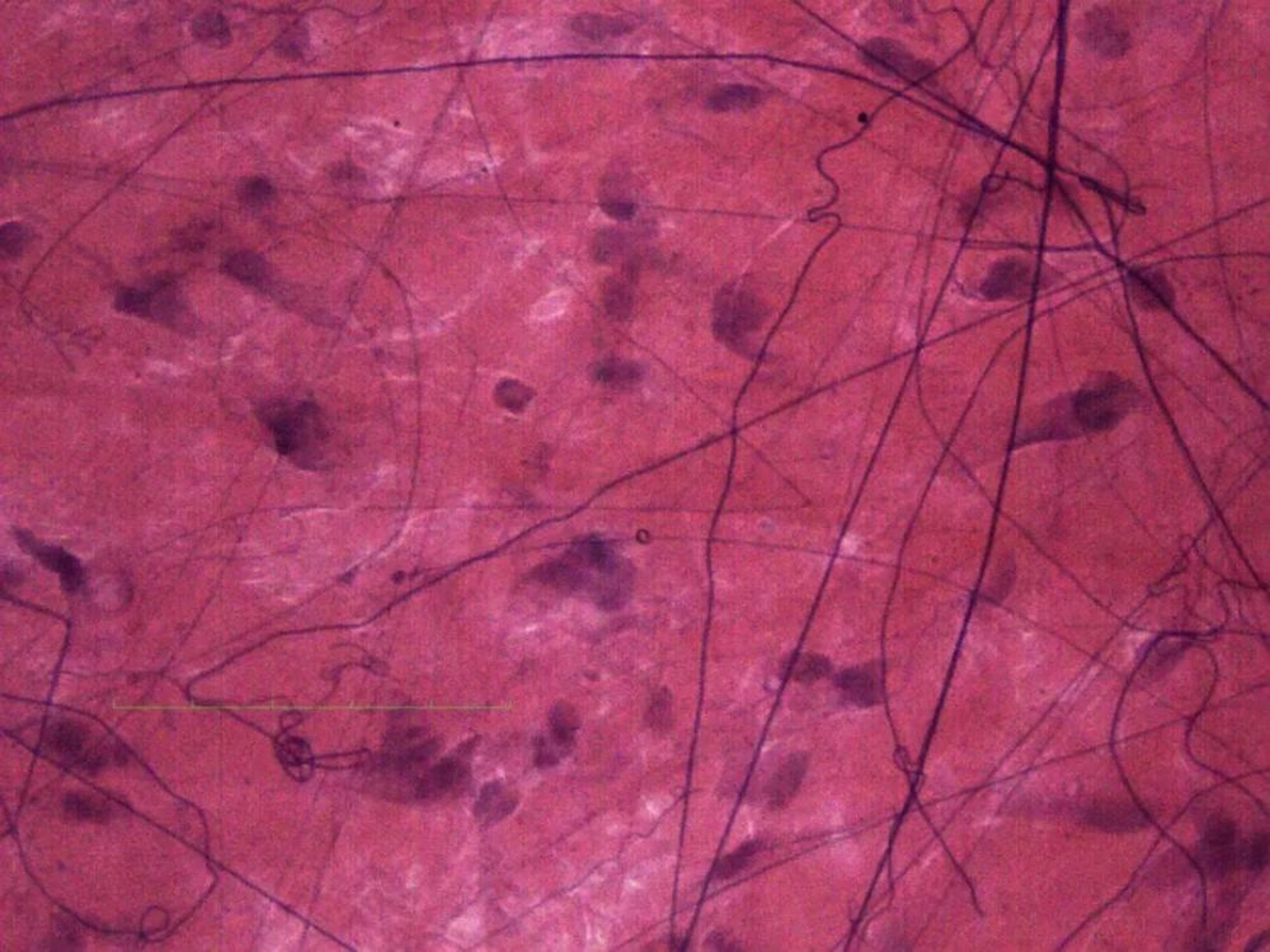 玫红的组织背景里,深色细丝肆意交织、蜿蜒穿梭,像一张温柔的微观蛛网。这些是结缔组织的纤维骨架——有的粗直坚韧,是支撑机体的胶原;有的细而卷曲,是赋予组织弹性的弹性纤维。散落在其间的深染斑点,是默默合成与维护这些纤维的成纤维细胞。它们共同构成了细胞外的“生命支架”,为器官与组织提供缓冲、连接与修复的力量,在方寸切片里,藏着机体柔软而坚韧的底层结构。