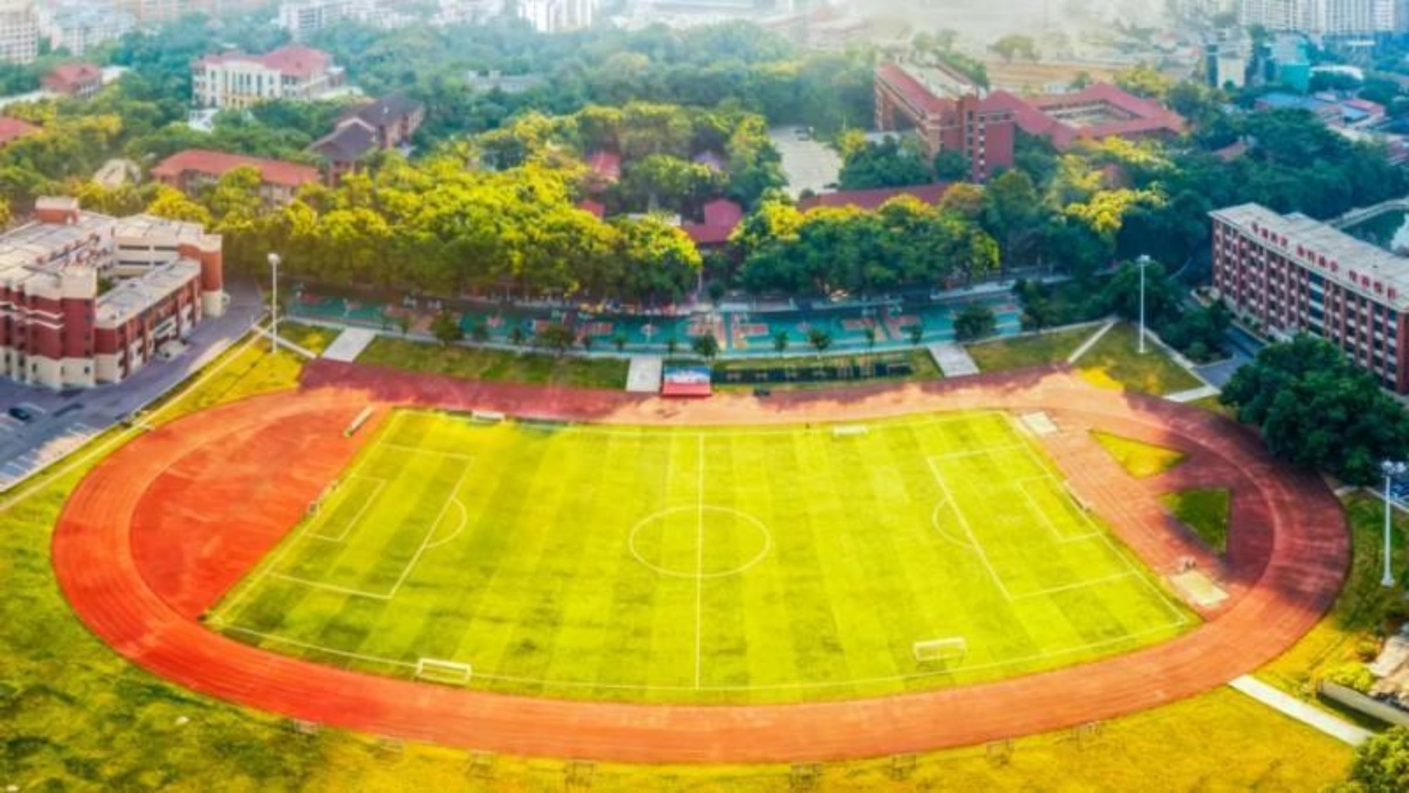 航拍视角下,院区景致如画。建筑连廊,规整道路,掩映绿树,写意成了“中国”的英文单词“China”。独具韵味的“回”字形“圈楼”占据了画面的大部,中间的空地上镶嵌着4个羽毛球场,仿佛看到一群充满活力的身影,正在这个传统与现代交融碰撞的学科交叉中心,以满腔热情投身强军伟业,映照出伟大祖国健步前进的壮阔征程。