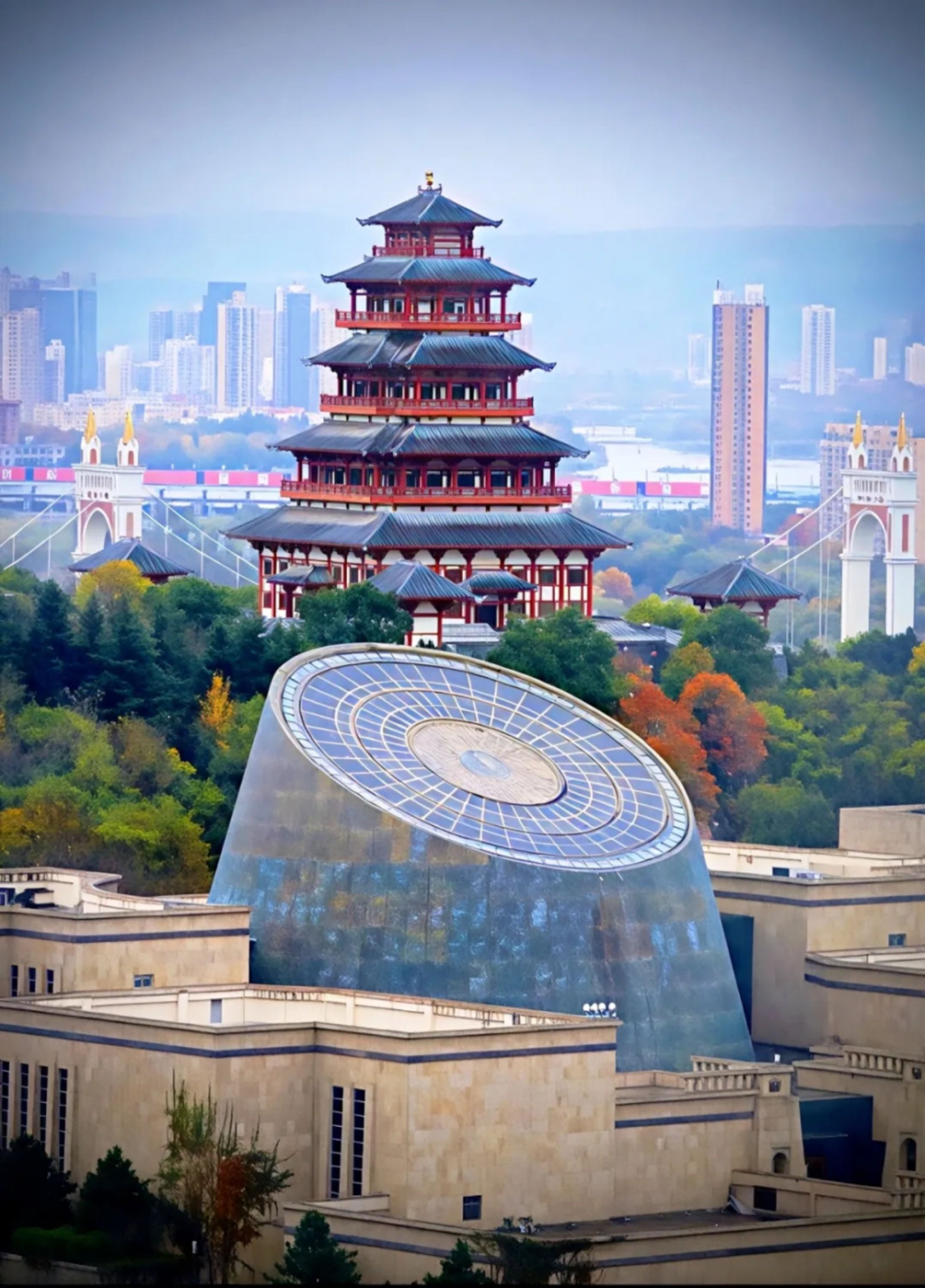 在我的家乡宝鸡的城景中,中华石鼓阁红檐层叠,古雅庄重如历史巨人;中国青铜器博物馆玻璃穹顶现代灵动,似文明宝匣。周围林木斑斓,远处楼群朦胧。一古一今的建筑,承载着宝鸡的青铜神韵与石鼓文脉,在岁月里静静诉说着千年文化的深厚底蕴。