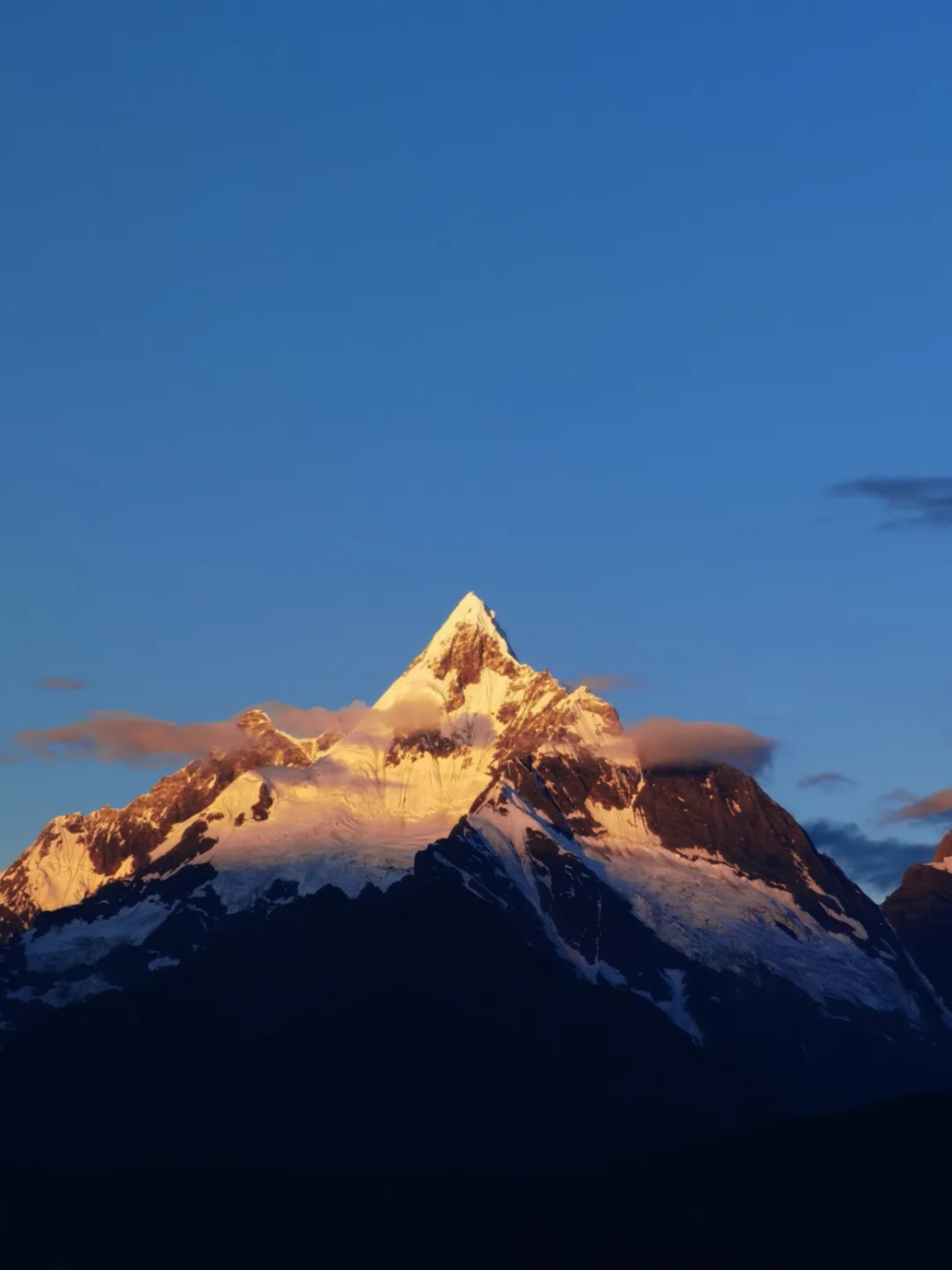 凌晨,梅里雪山仍浸在藏青色的夜幕,万籁俱寂,繁星冷澈。东方山脊先绽开一道幽蓝缝隙,淡粉的鱼肚白轻轻晕染天际。倏忽间,第一缕金光跃出裂缝,挑开夜色的帷幕。光瀑自神女峰尖倾泻而下,沿着雪脊奔腾,为她戴上鎏金王冠,继而金潮漫卷,点亮整片天空,群山随之苏醒。