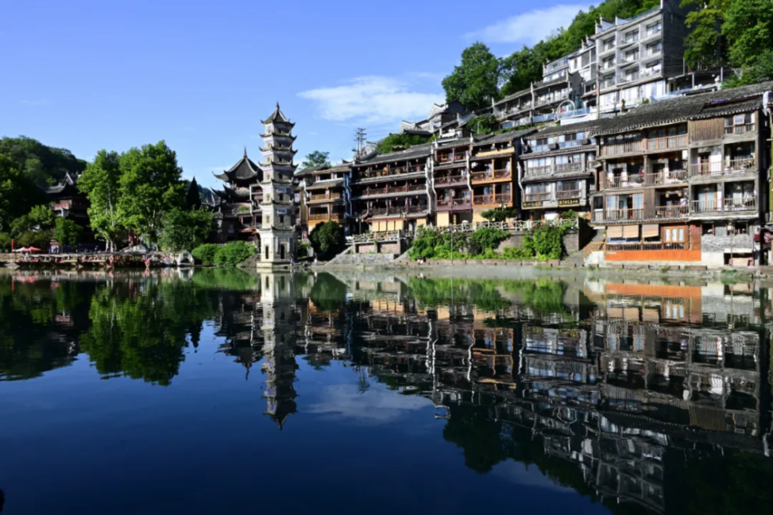 沱江的水面像镜子一样将万名塔和两岸的建筑、绿树都清晰地倒映出来,形成了一幅美丽的山水画卷。这里不仅是游客们喜爱的拍照打卡地,也承载着凤凰古城悠久的历史和文化记忆。漫步在沱江边,看着万名塔和周围的美景,能让人深切感受到凤凰古城的独特魅力。