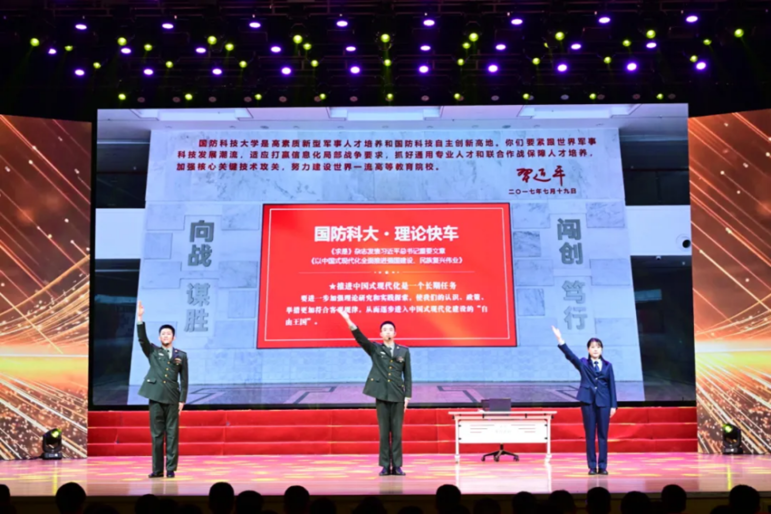 晚会现场,来自教学科研、管理保障等各条战线、平凡岗位上的先进典型,走到聚光灯下,迎来专属于他们的高光时刻。大合唱《战歌为胜利唱响》铿锵嘹亮,将晚会氛围推至高潮。最后,晚会在全体合唱《强军战歌》中圆满结束。