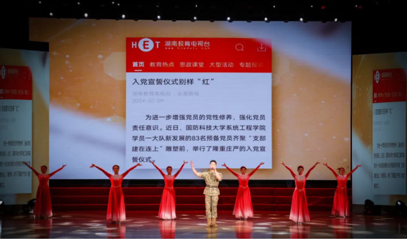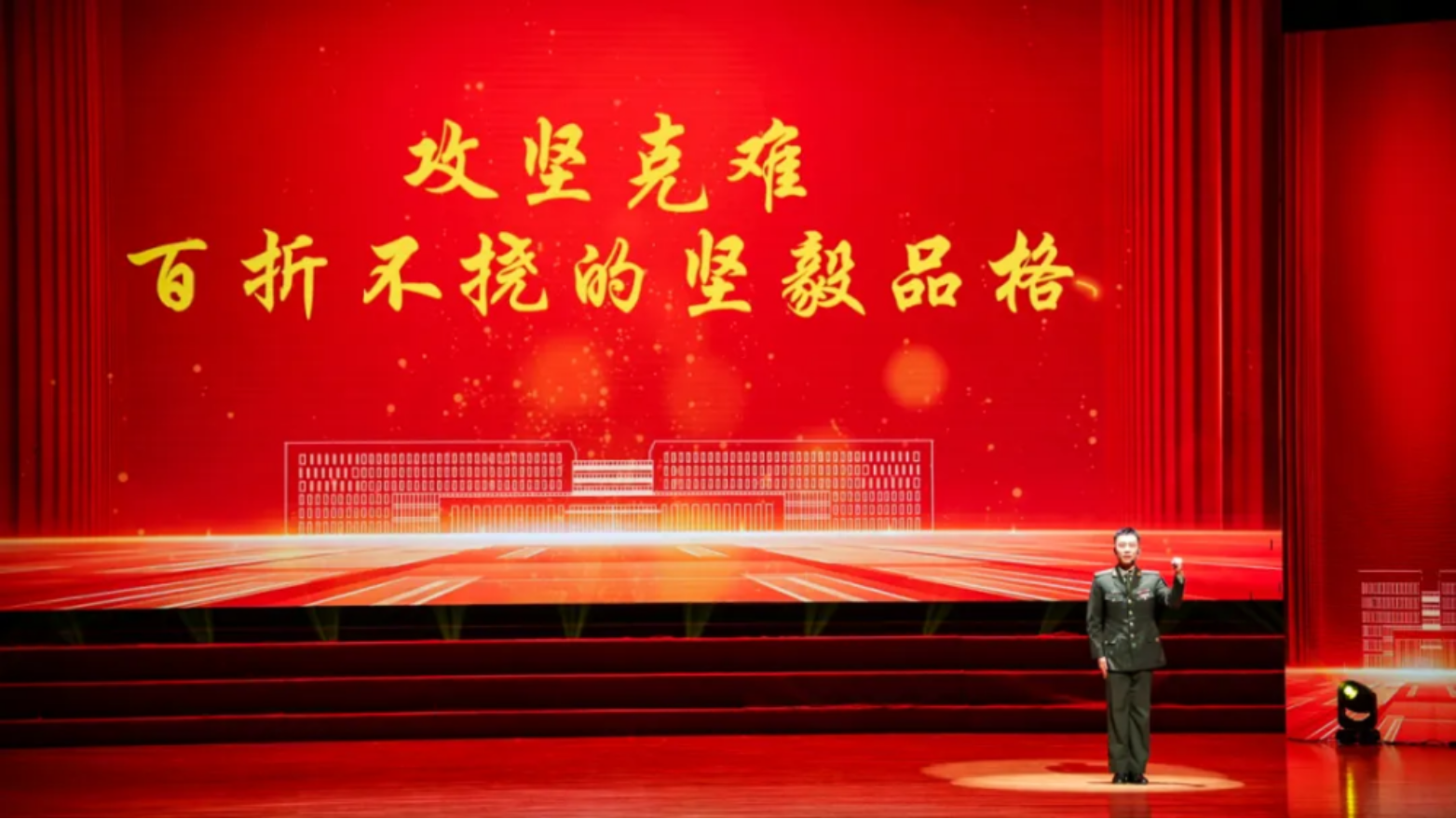 音诗画《何为忠诚》通过一场学子与师长们穿越时空的对话,展现了著名科学家钱学森指导建系和老一辈系统工程人心怀强国强军之志、筚路蓝缕艰苦创业的光辉历程。歌舞《阵地》表达了师生员工们坚守战位铸魂育人的忠诚与担当。