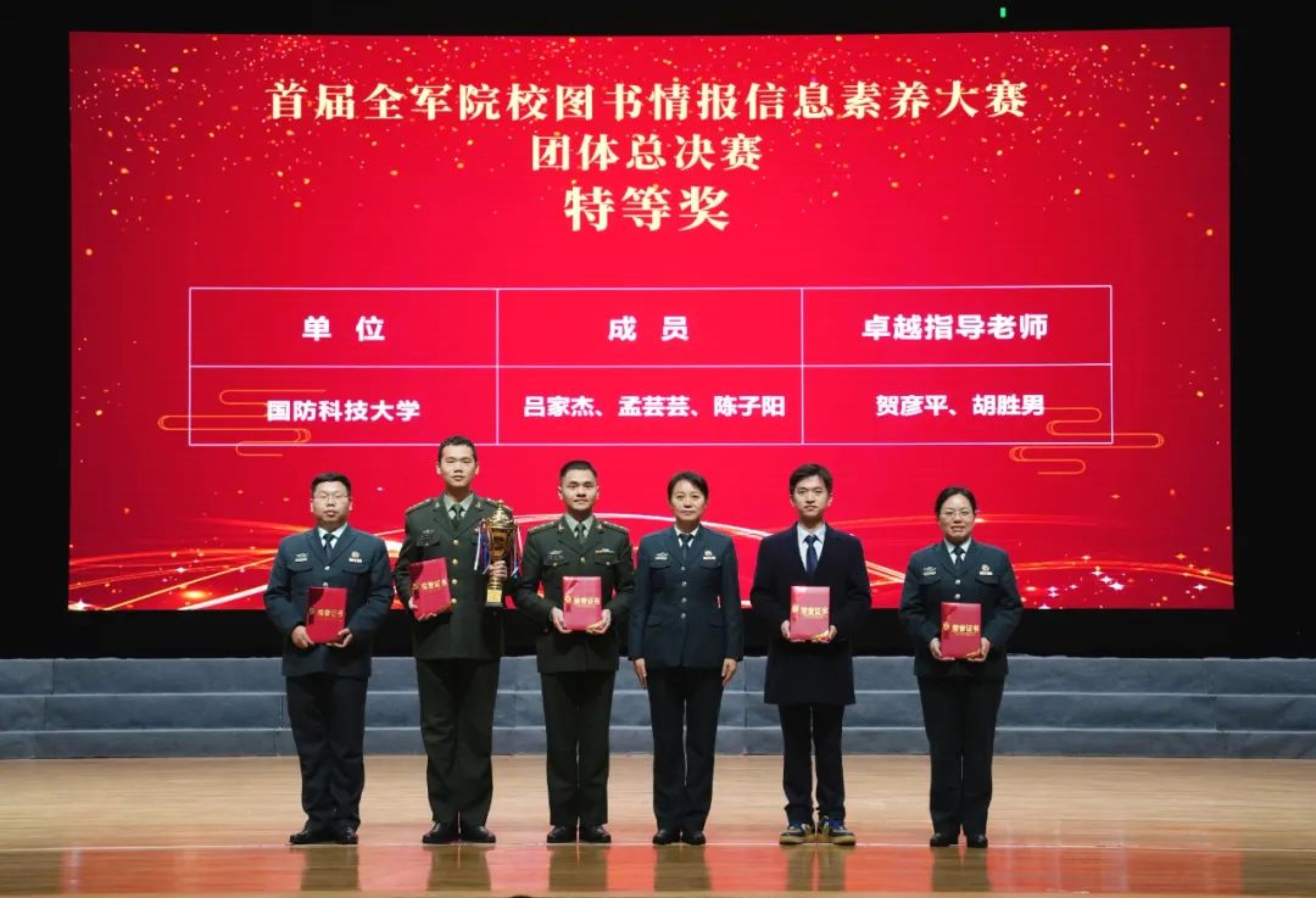总决赛共设置四轮答题,答题紧密围绕当今世界军事形势、思想政治理论、图书情报等知识展开,考验参赛学员在信息检索应用及信息安全等方面的综合能力。最终,学员团体总决赛中,国防科技大学吕家杰、孟芸芸和陈子阳组成的“强军智搜队”荣获特等奖,海军军医大学“深蓝卫勤队”与武警警官学院“忠勇劲旅队”分别获得大赛一等奖;教员组创新案例奖评比中,国防科技大学荣获特等奖,空军预警学院、陆军工程大学(军械士官学校)荣获一等奖。