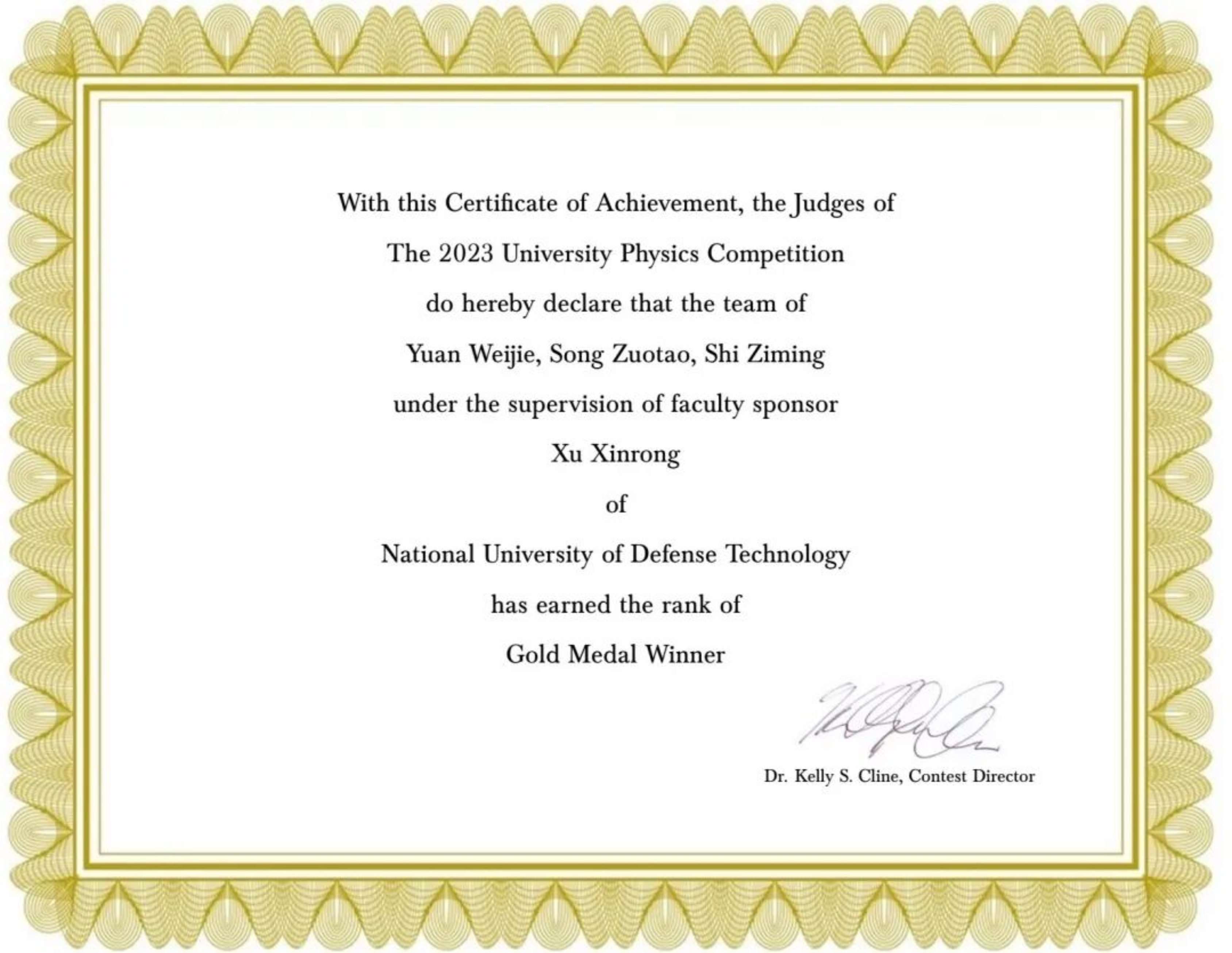 近日,第十四届国际大学生物理竞赛成绩揭晓,国防科技大学理学院大学物理课程教学团队指导的参赛队斩获金奖2项,银奖22项,再次刷新历史最好成绩。这也是学校连续七届在该赛事中斩获金奖。其中,学员袁伟杰、宋作涛、史子鸣和彭浩洋、杨海锟、钟瑞所在组别分别斩获金奖。