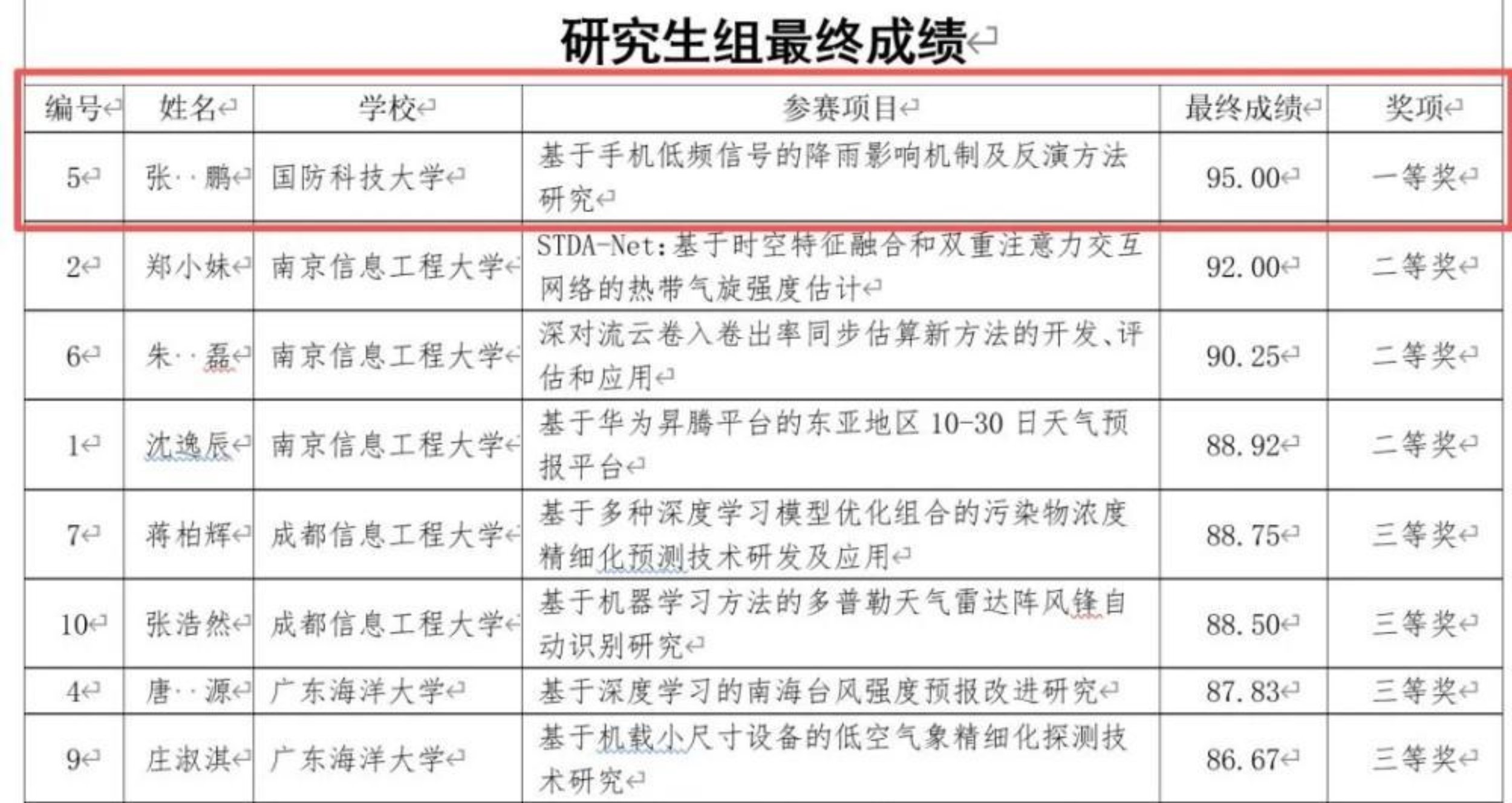 近日,由中国气象学会举办的首届全国大学生气象科技创新大赛在南京信息工程大学圆满落幕。气象海洋学院本科学员刘桓江在20支决赛队伍中胜出,获得本科组一等奖;研究生学员张鹏荣获研究生组一等奖;本科学员秦佳琦、王志成,军士学员吴炫江获二等奖;军士学员张鹏宇获三等奖。