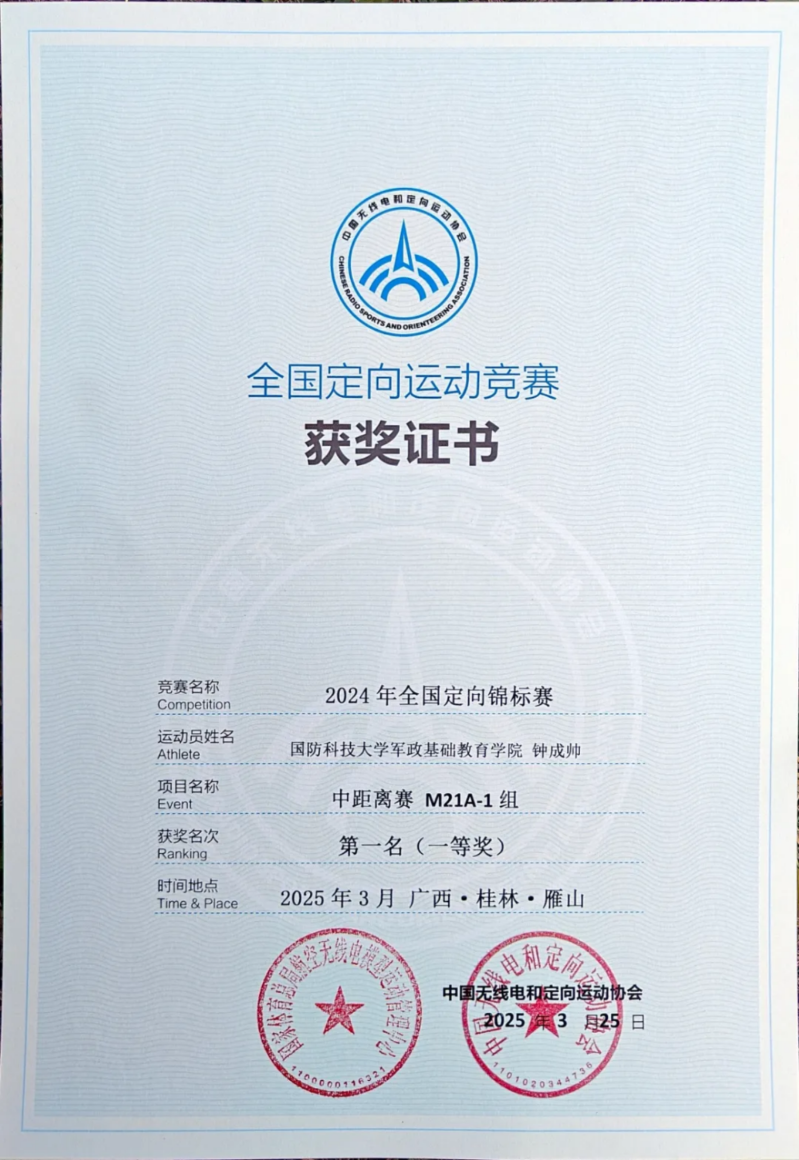 该赛事由国家体育总局航空无线电模型运动管理中心和中国无线电和定向运动协会主办。此次比赛共有来自全国各地的117支队伍912名运动员参赛,最终评选出一等奖15项、二等奖118项、三等奖201项。其中,国防科大学员钟成帅以第一名的成绩勇夺中距离男子21岁组一等奖。
